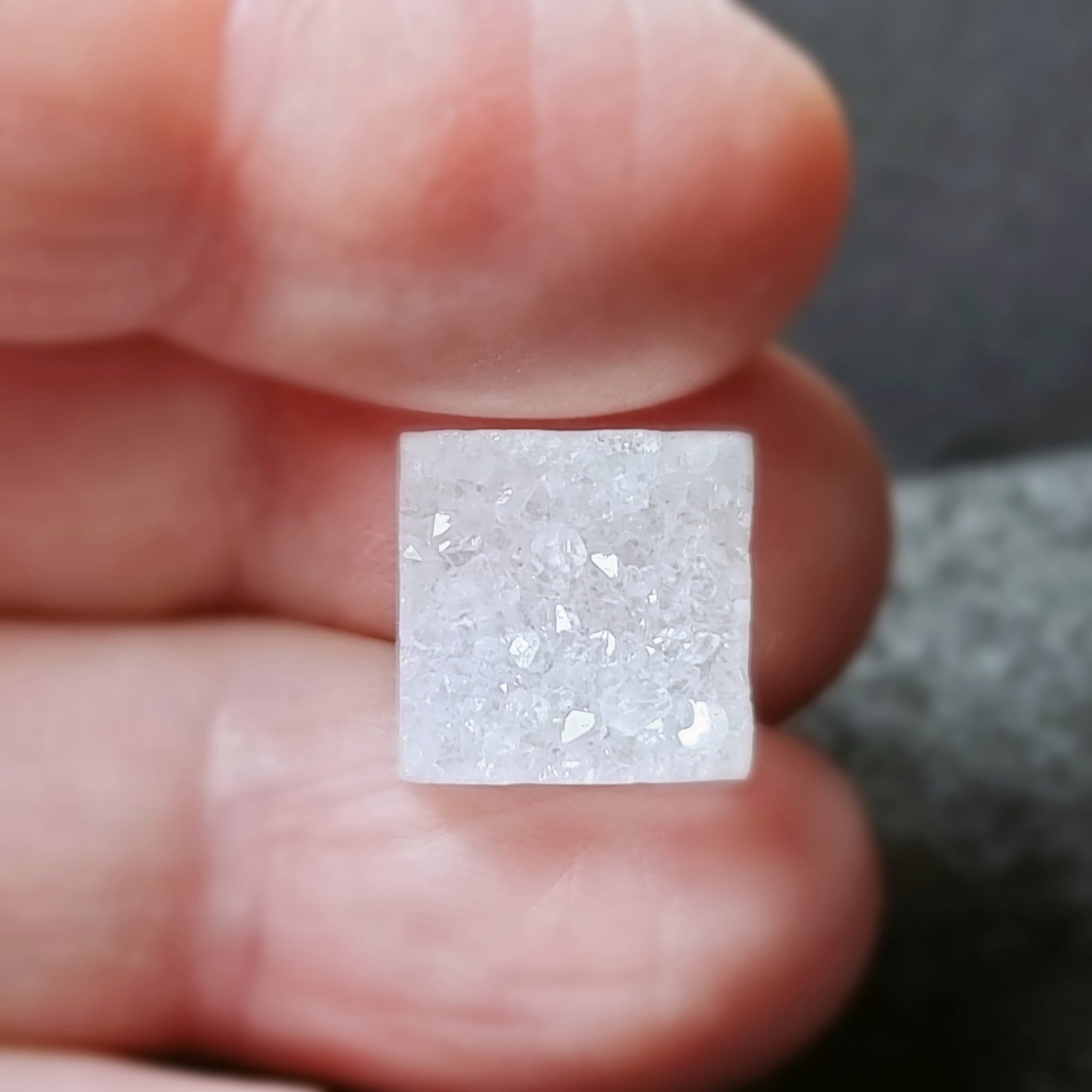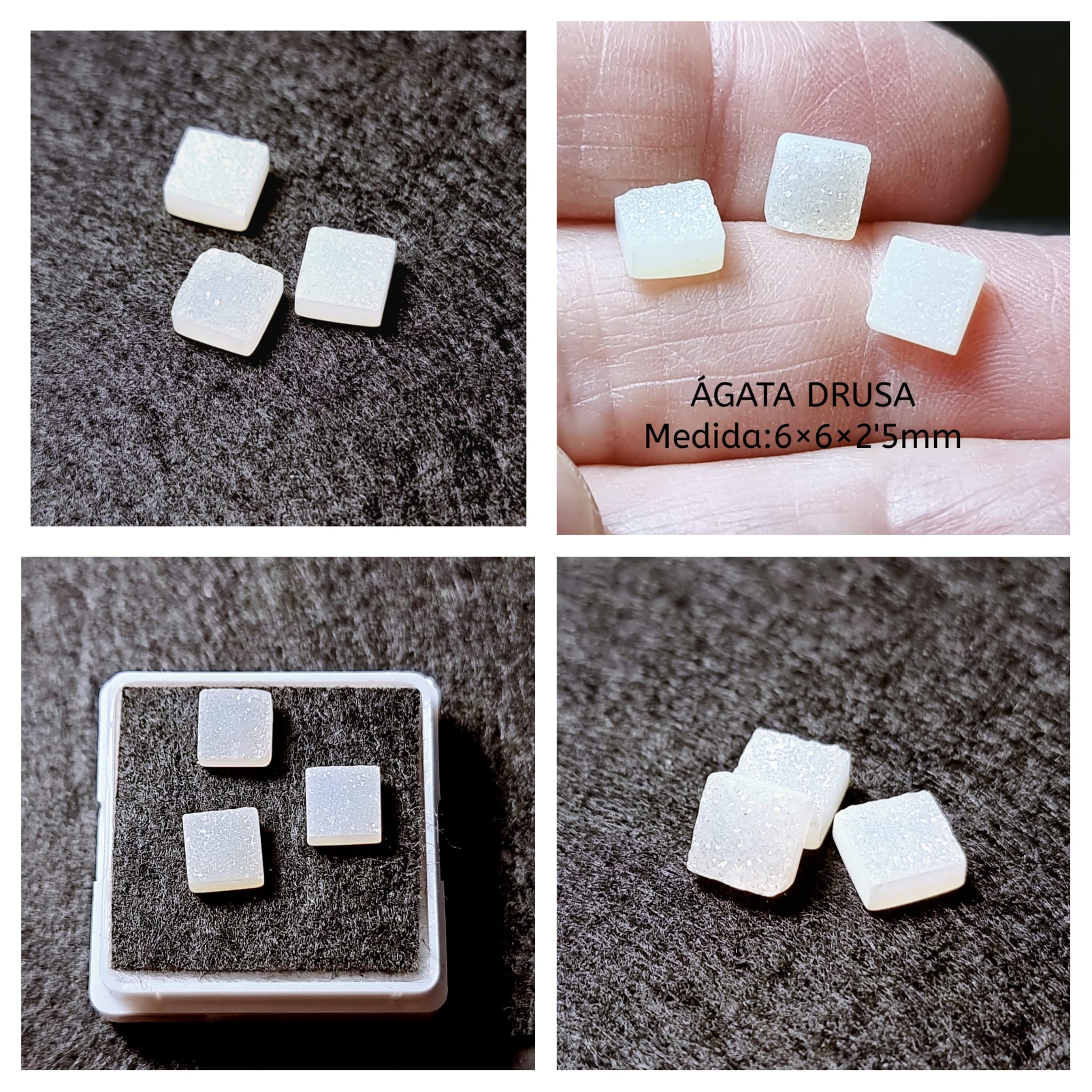 Bonita Ágata Drusa con preciosa cristalización. Origen: Sudáfrica Tallado y pulido en Alemania Talla: Cuadrado Medida: 6 x 6 x 2'5 mm Precio unitario Unidades disponibles: 3