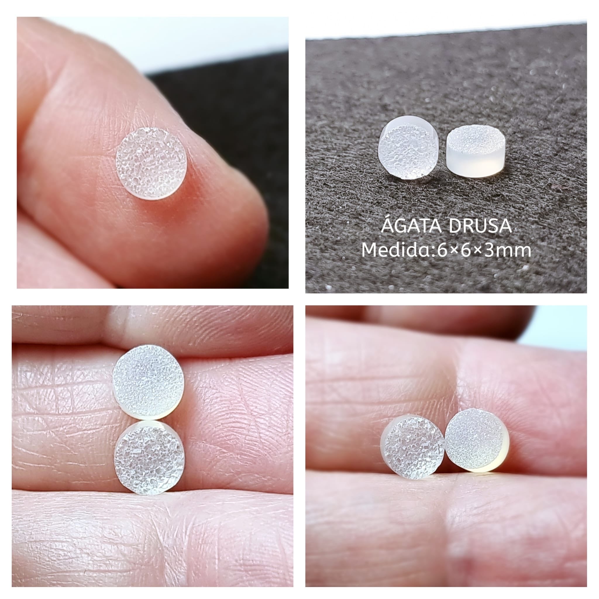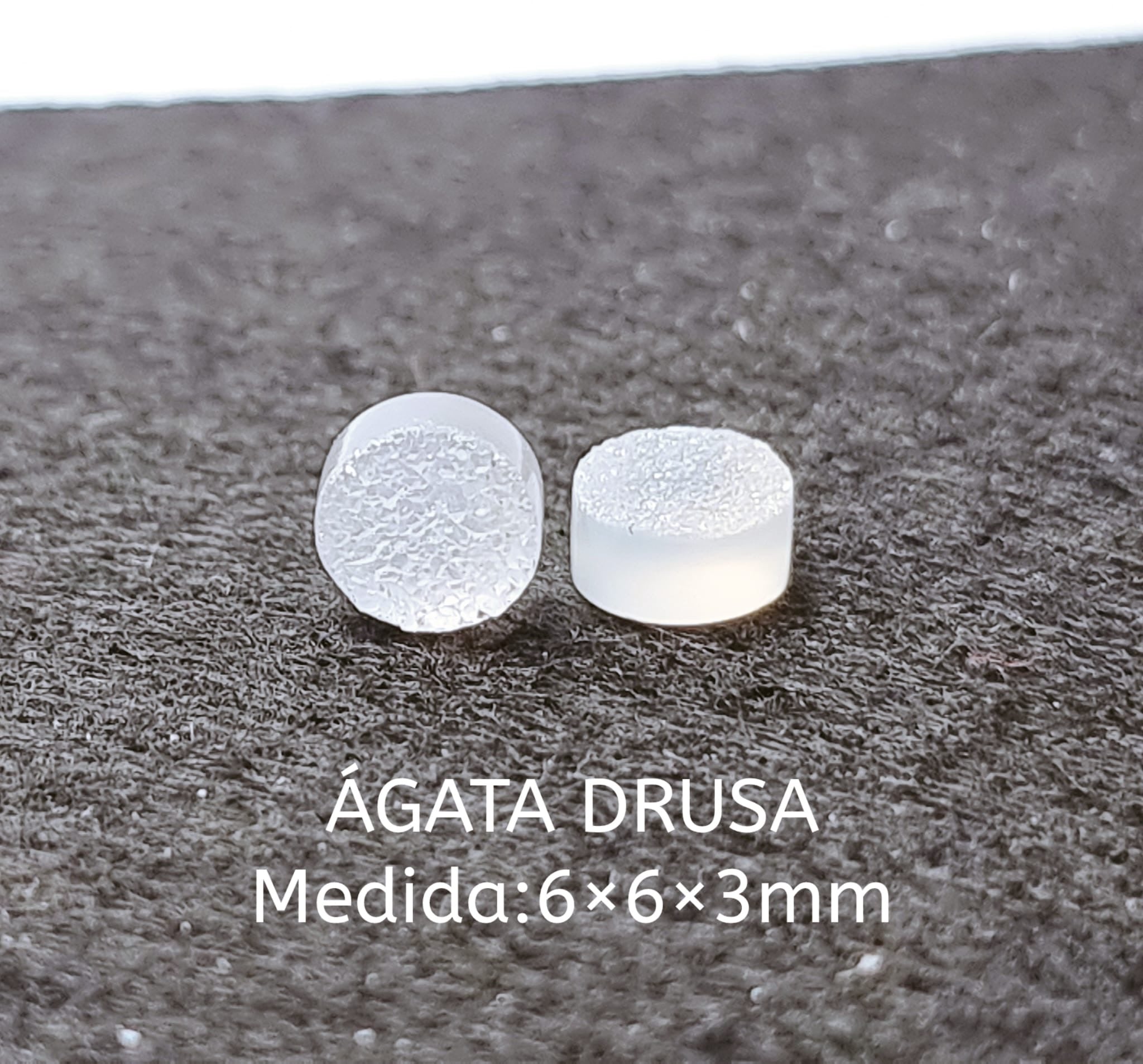 Ágata Drusa con preciosa cristalización Origen: Sudáfrica Tallado y pulido en Alemania Talla: Redonda Medida: 6 x 6 x 3 mm Precio unitario Unidades disponibles: 2 La tonalidad y la cristalización de la piedra, al ser natural, puede variar.