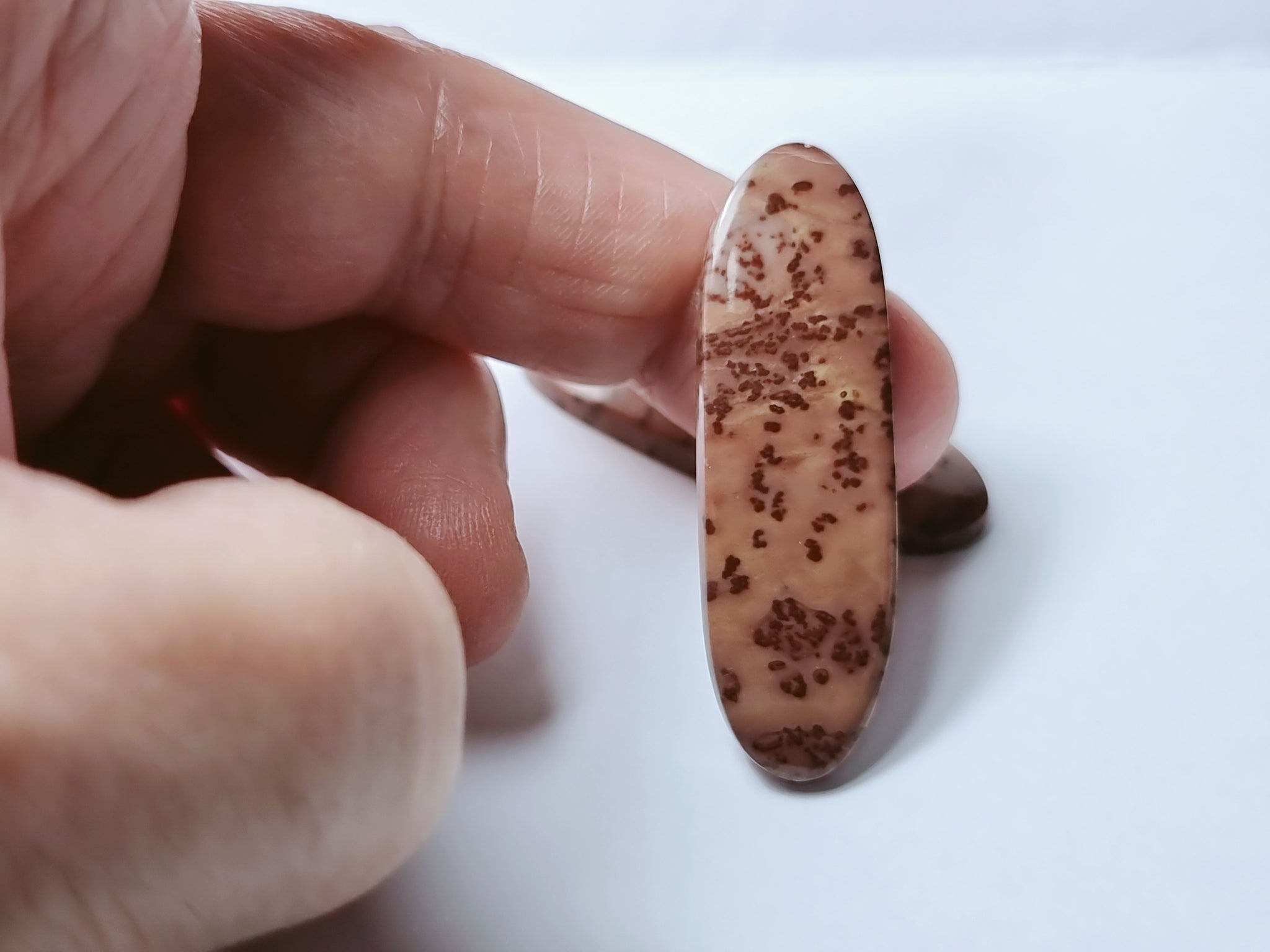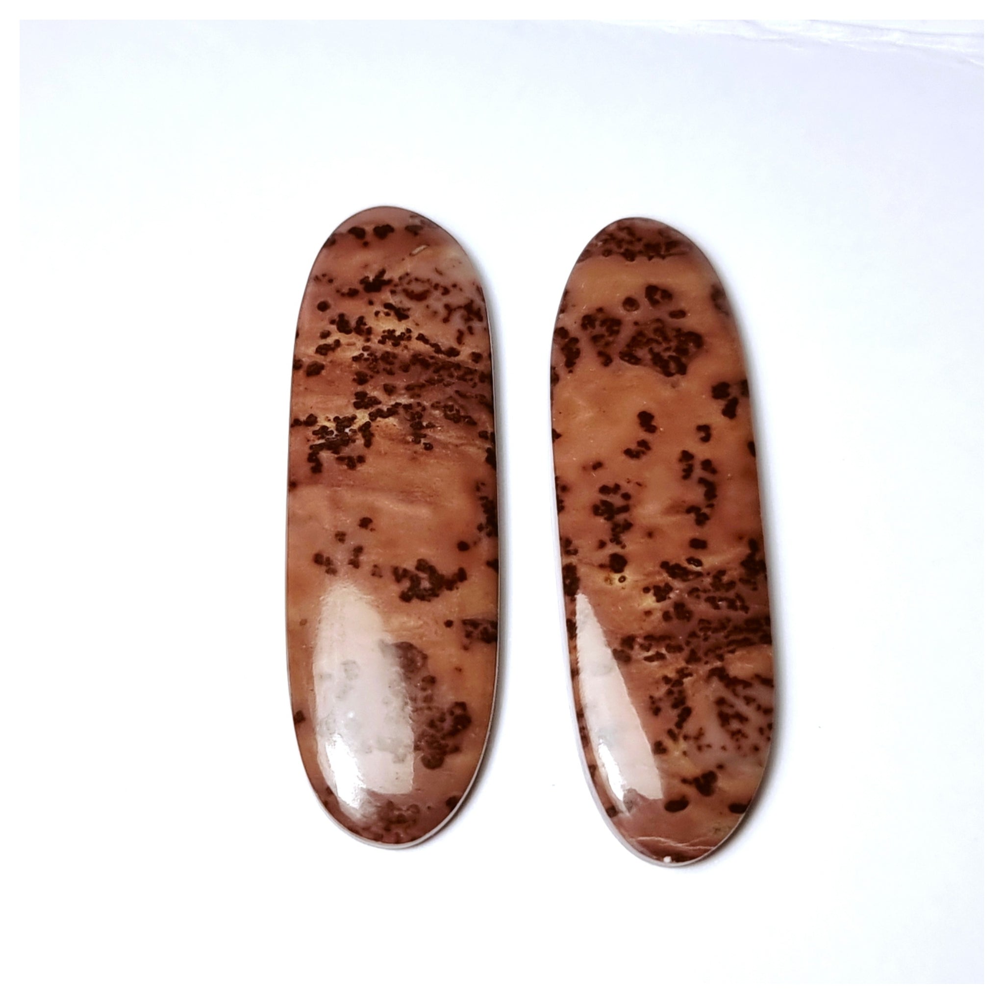 Bonito Jaspe de MadagascarOrigen: MadagascarTallado y pulido en BarcelonaTalla: Cabujón oval FancyMedida: 41x14x4mmCantidad disponible: 2Precio unitario