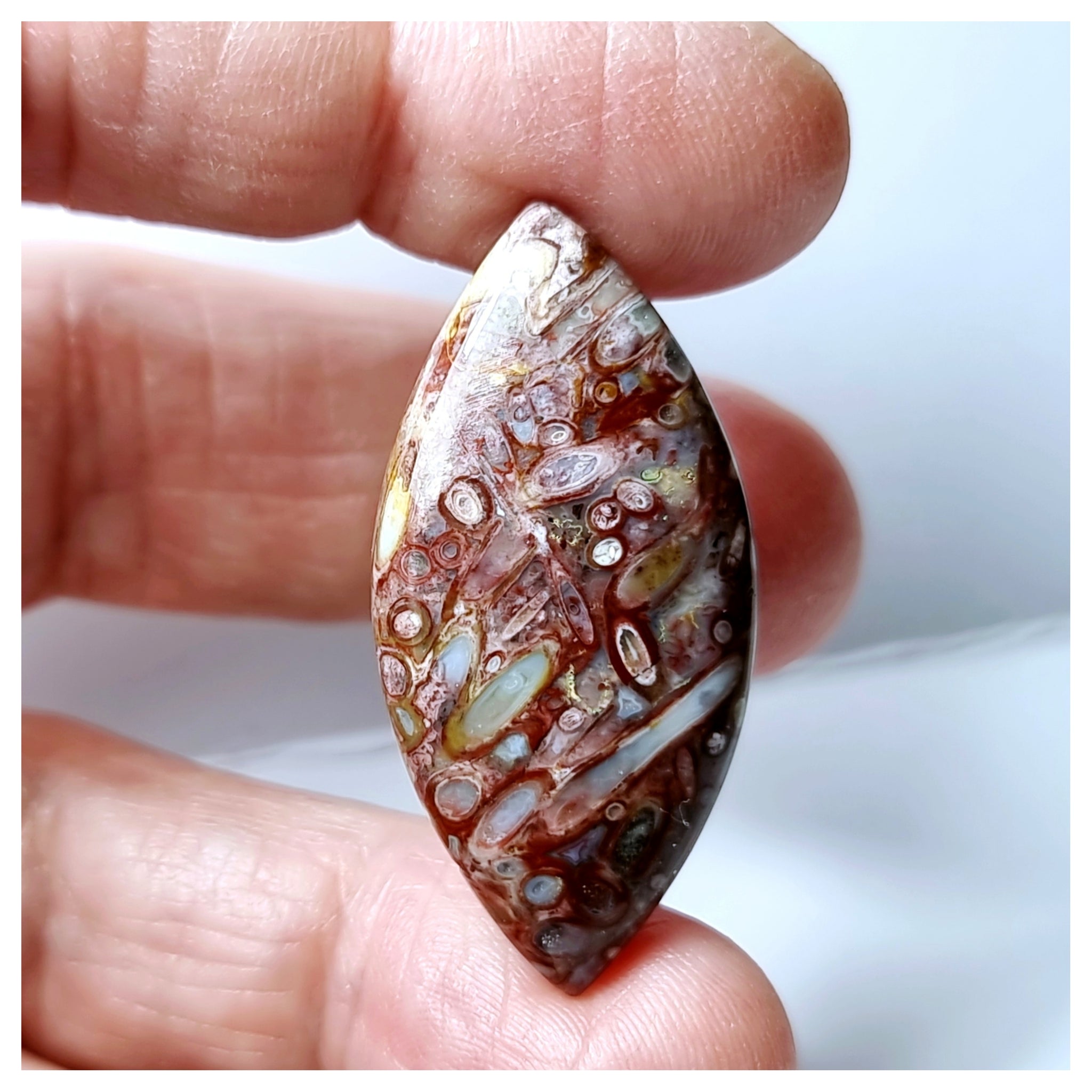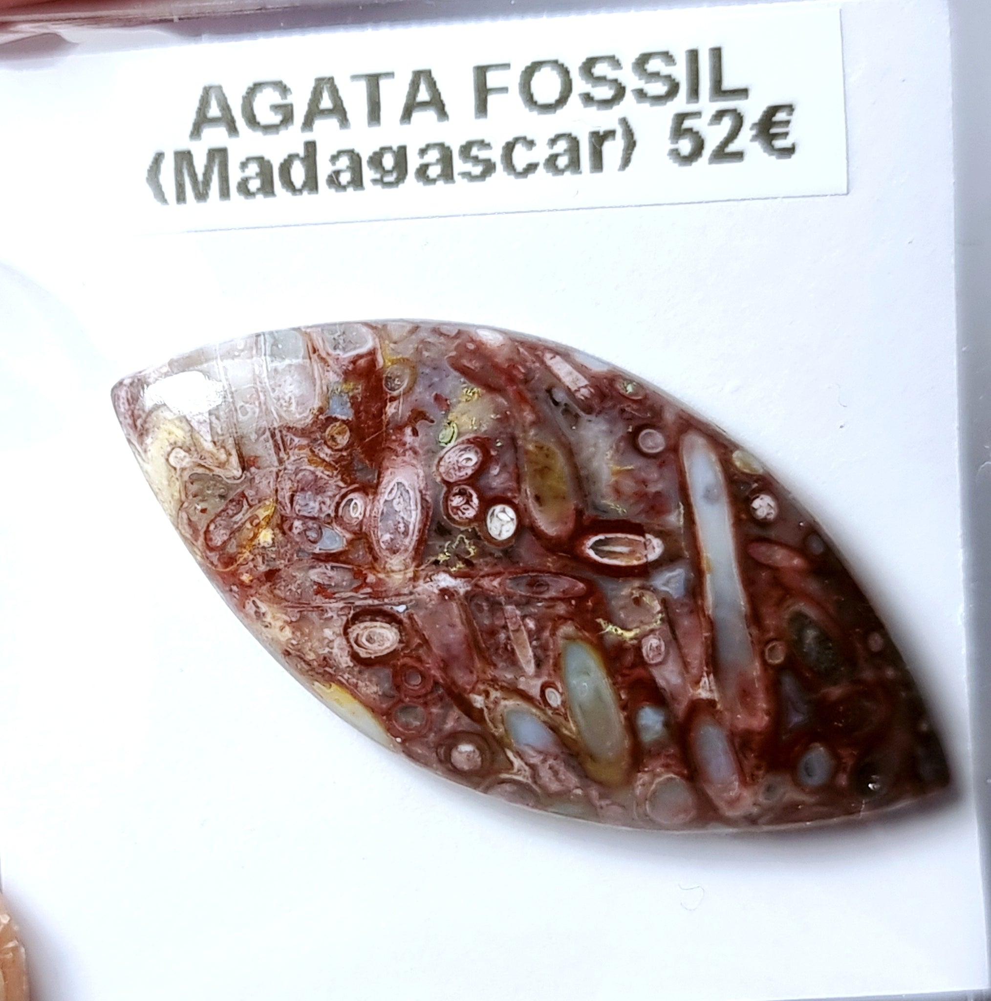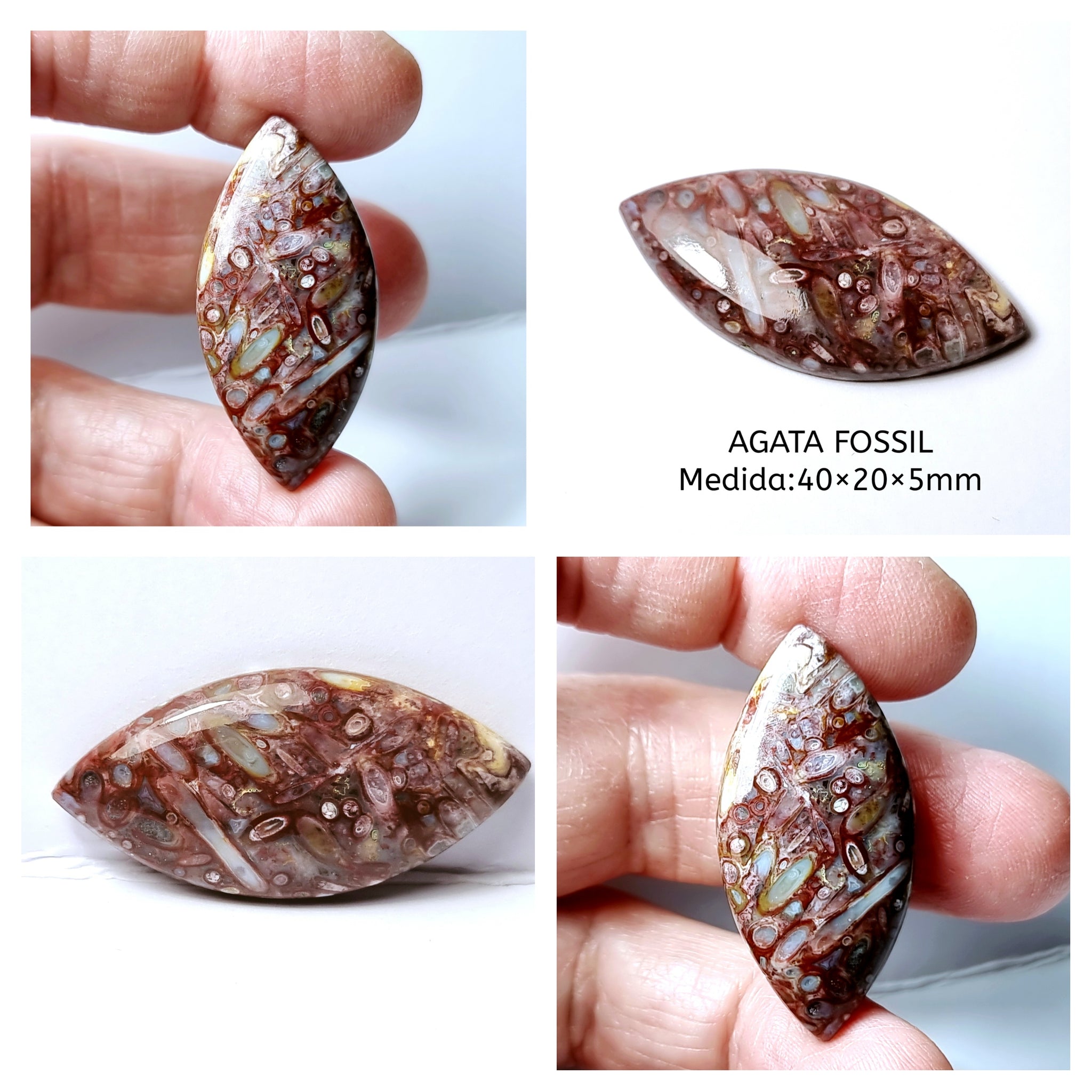 Bonito cabujón de Ágata FóssilOrigen: MadagascarTallado y pulido en BarcelonaTalla: Cabujón NavetteMedida: 40x20x5mm
