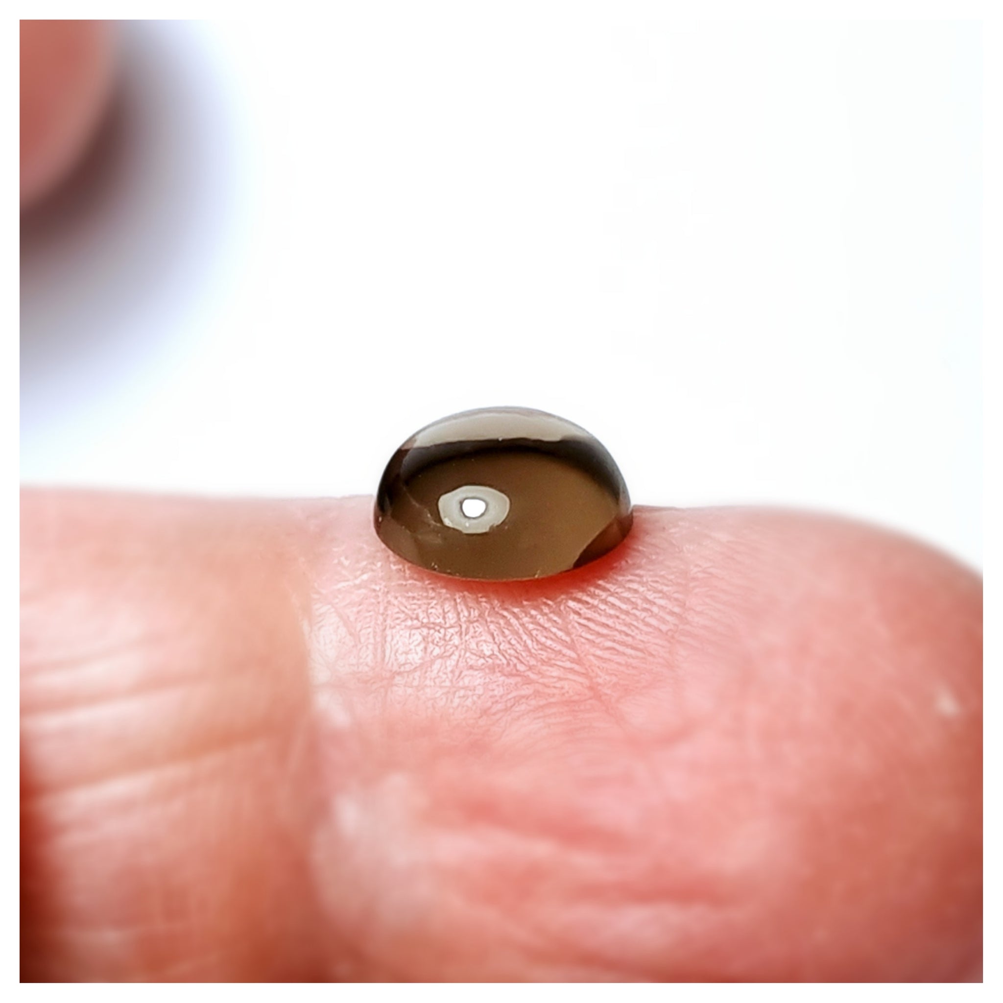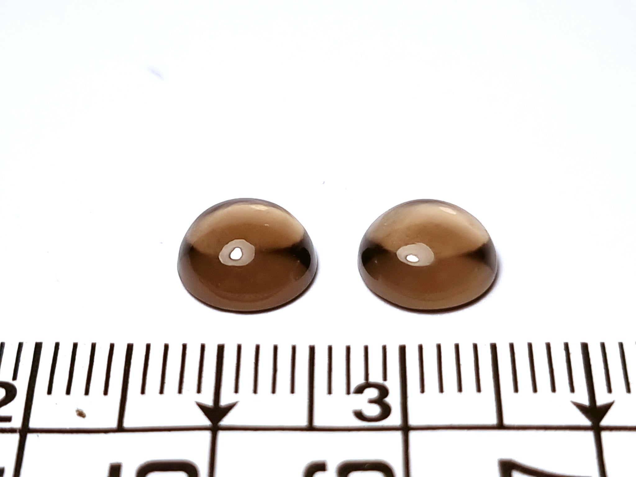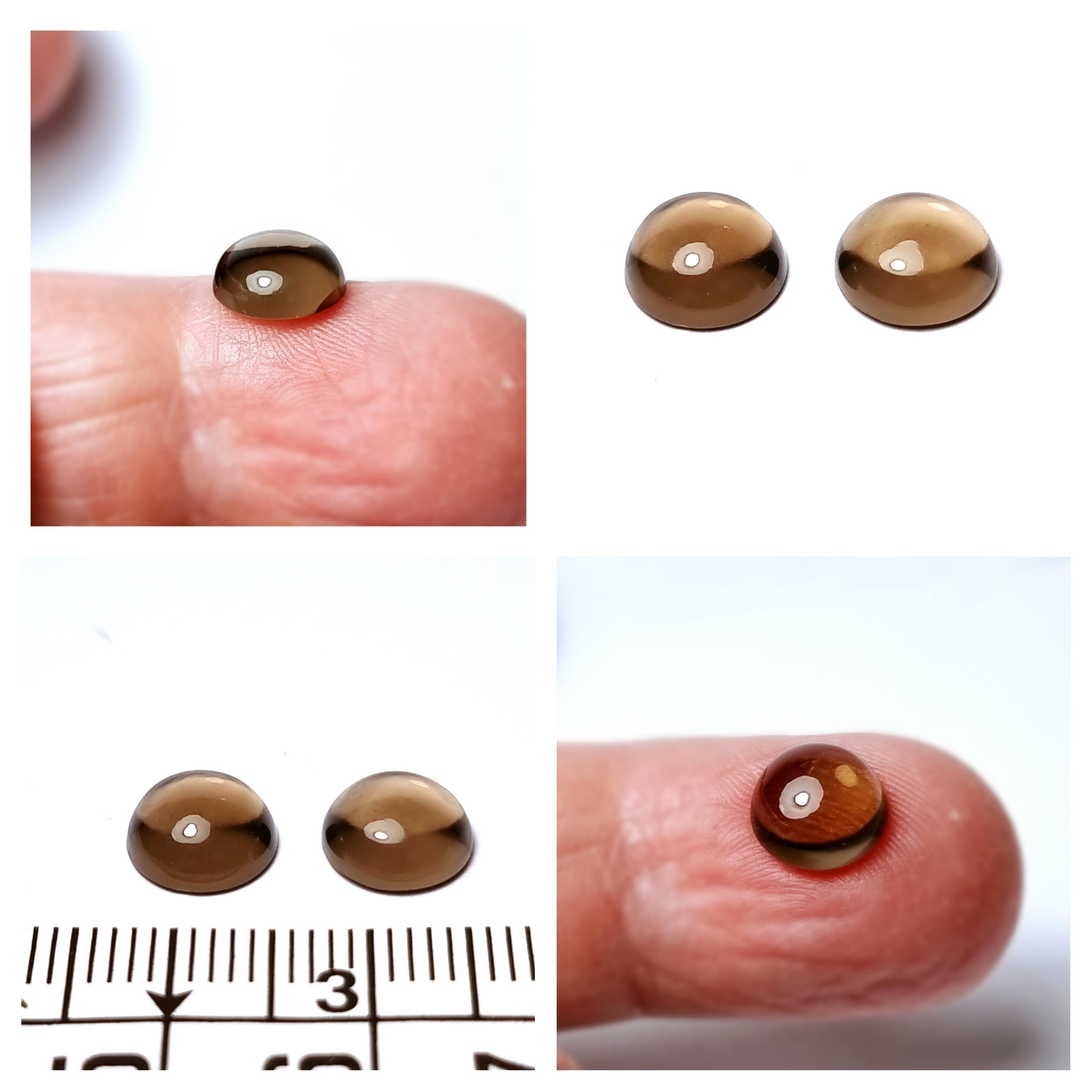 Pareja de Cuarzo Fumé excelente pureza y de bonito color Origen: Brasil Tallado y pulido en Barcelona Talla: Cabujón redondo Medida: 8'00x3'50mm Cantidad disponible: 2 Precio unitario