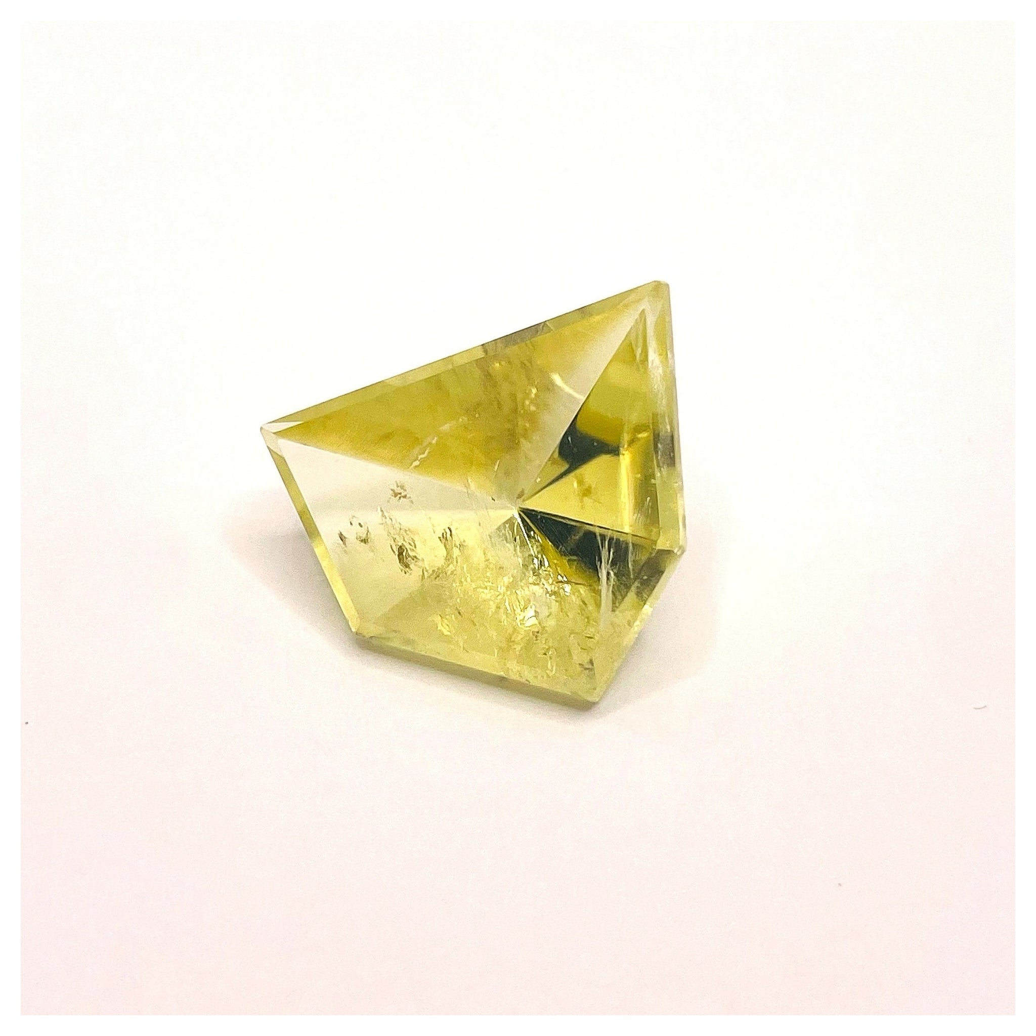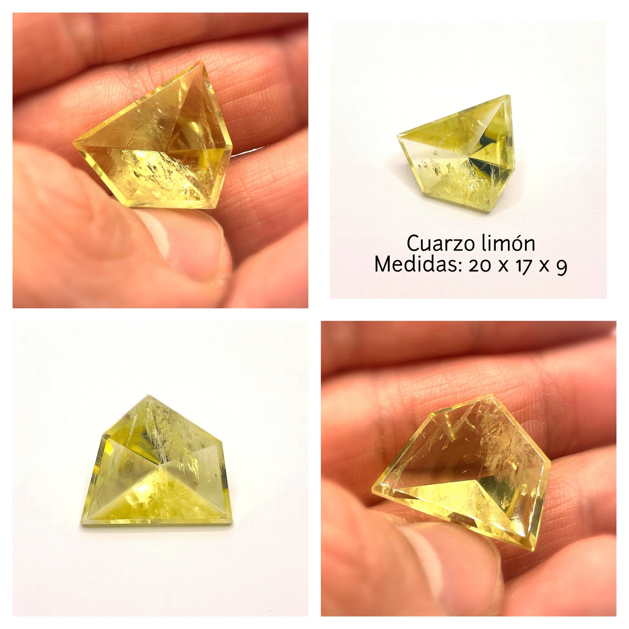 Bonito Cuarzo Limón con inclusiones naturalesOrigen: BrasilTallado y pulido en BarcelonaTalla: Facetada espejoMedida: 20 x 17 x 9 mm
