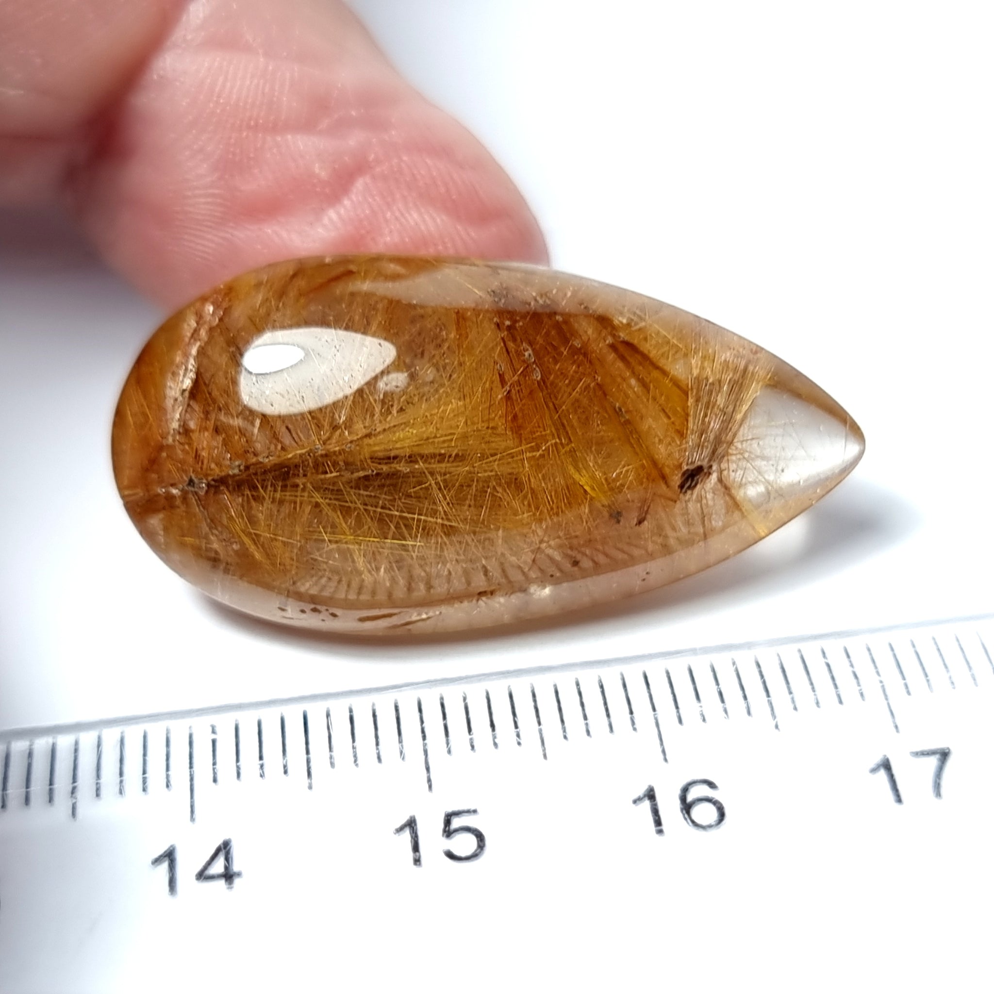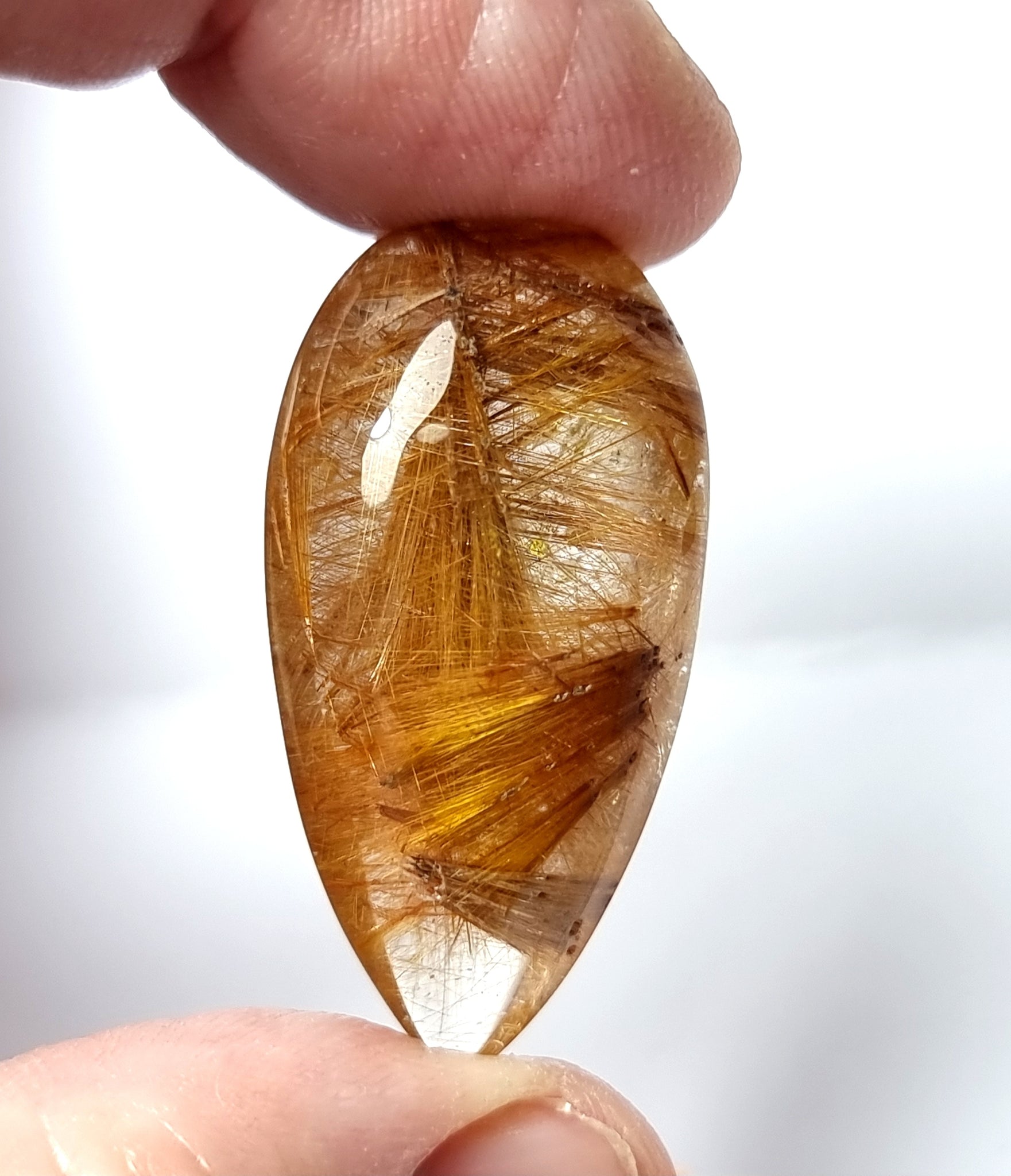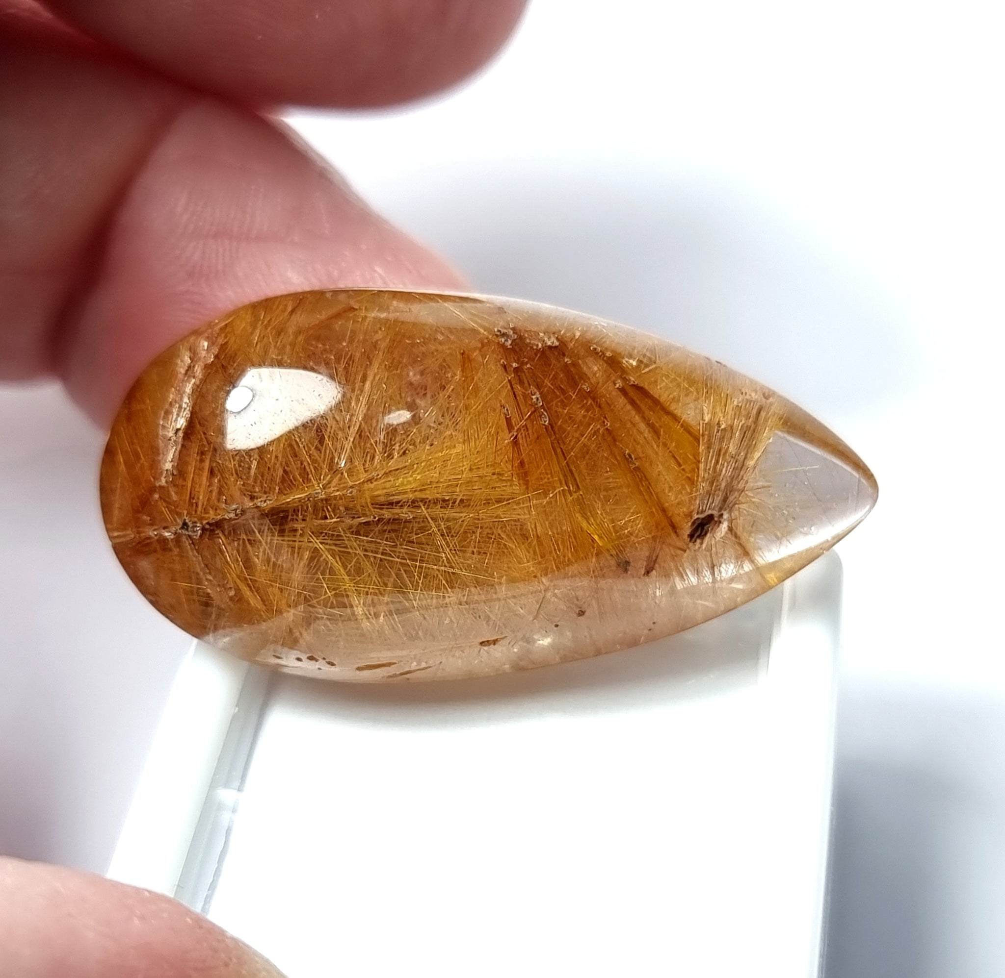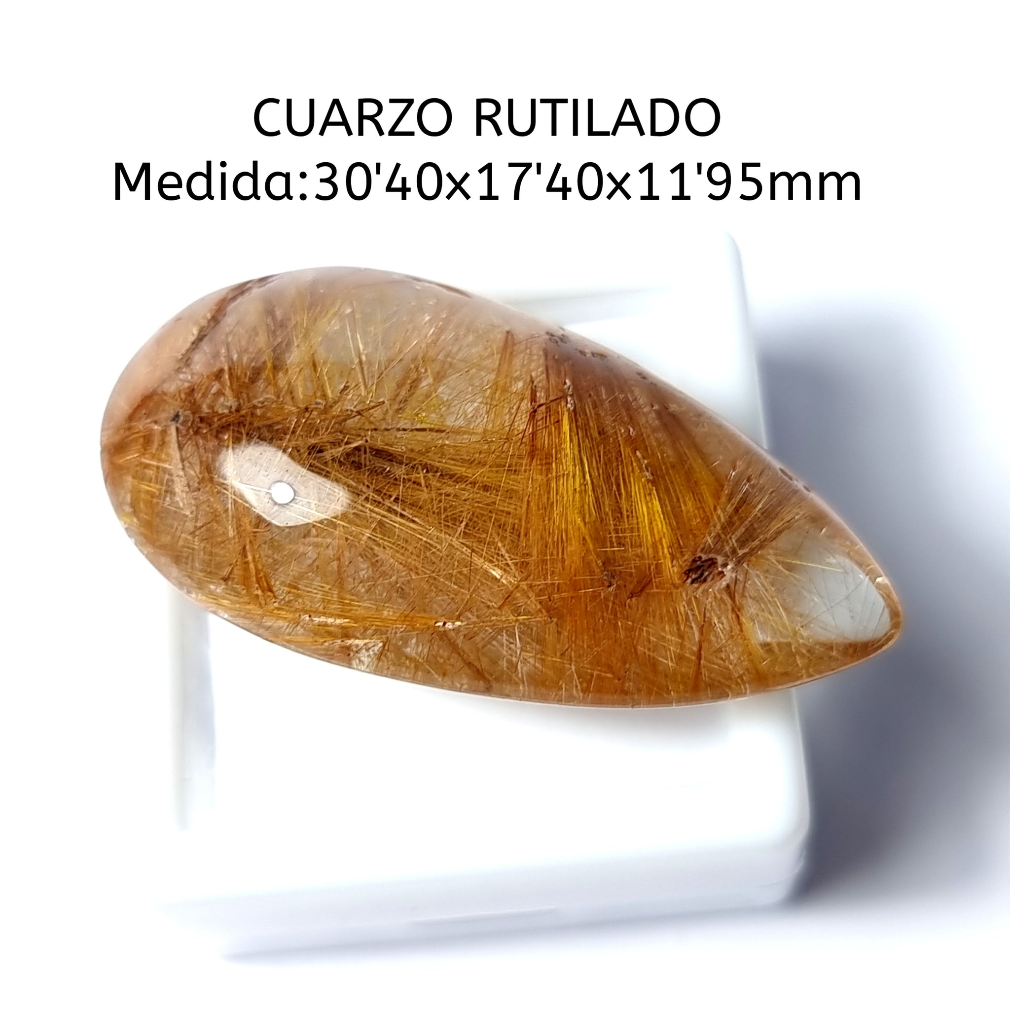 Fantástico cabujón de Cuarzo Rutilado. Rutilos naranja intenso Origen: Brasil Tallado y pulido en Barcelona Talla: Cabujón pera Medida: 30'40x17'40x11'95mm