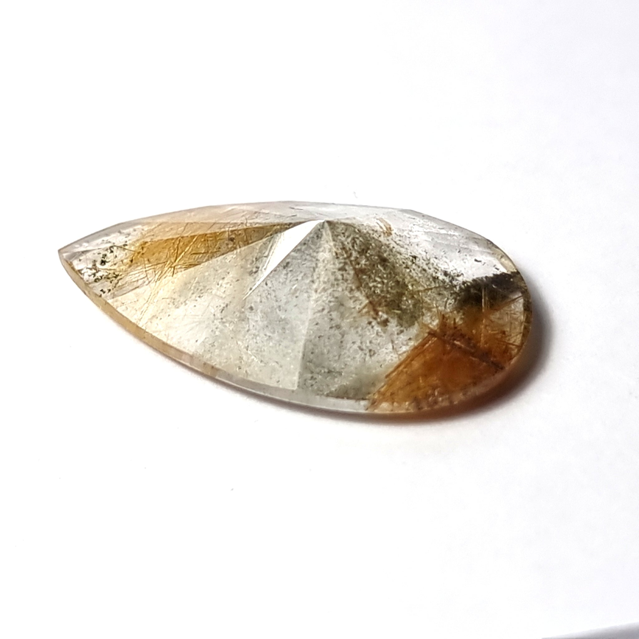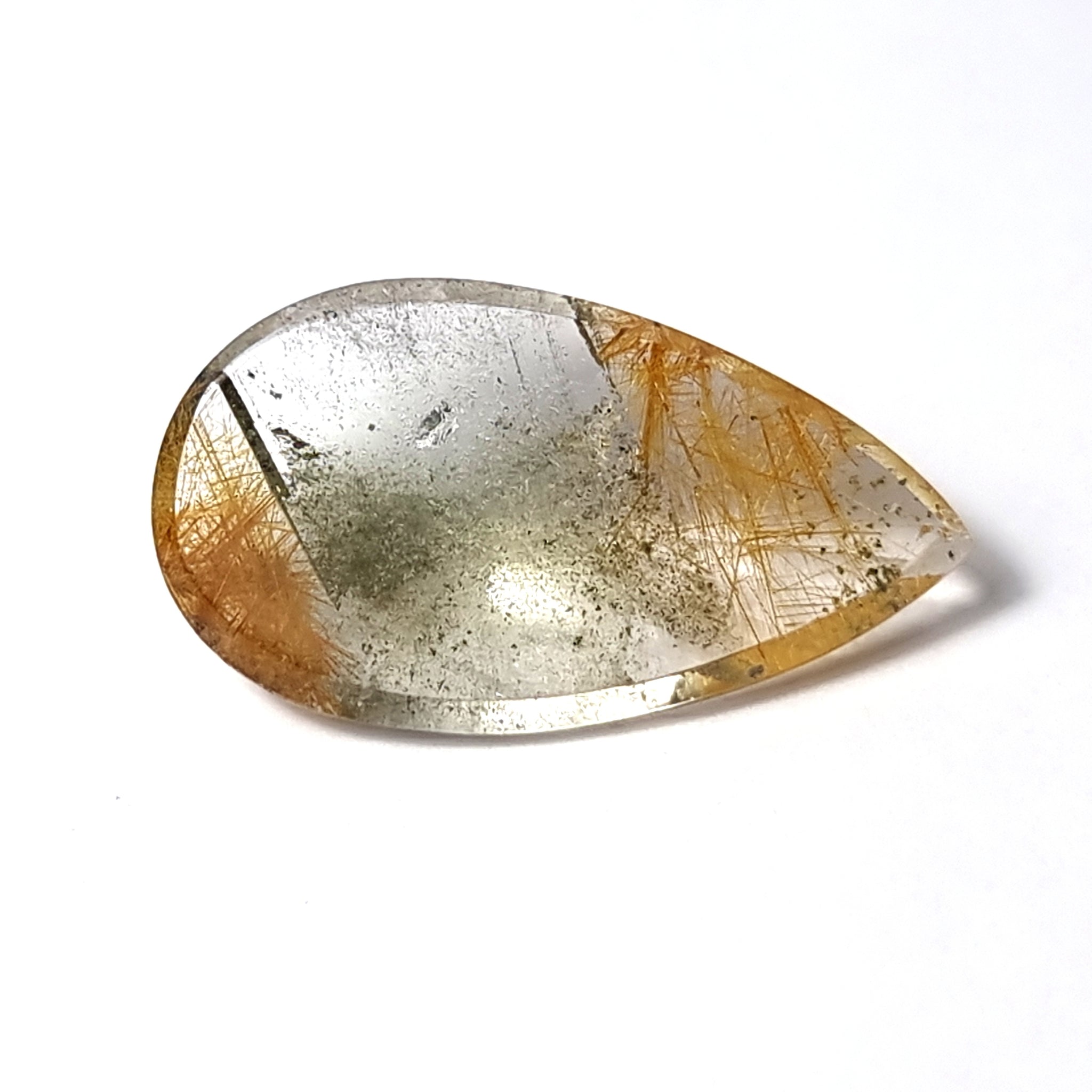 Precioso Cuarzo Rutilado con rutil dorado y tonos verdes/grises Origen: Brasil Tallado y pulido en Barcelona Talla: Talla espejo lágrima Medida: 23x13x7mm