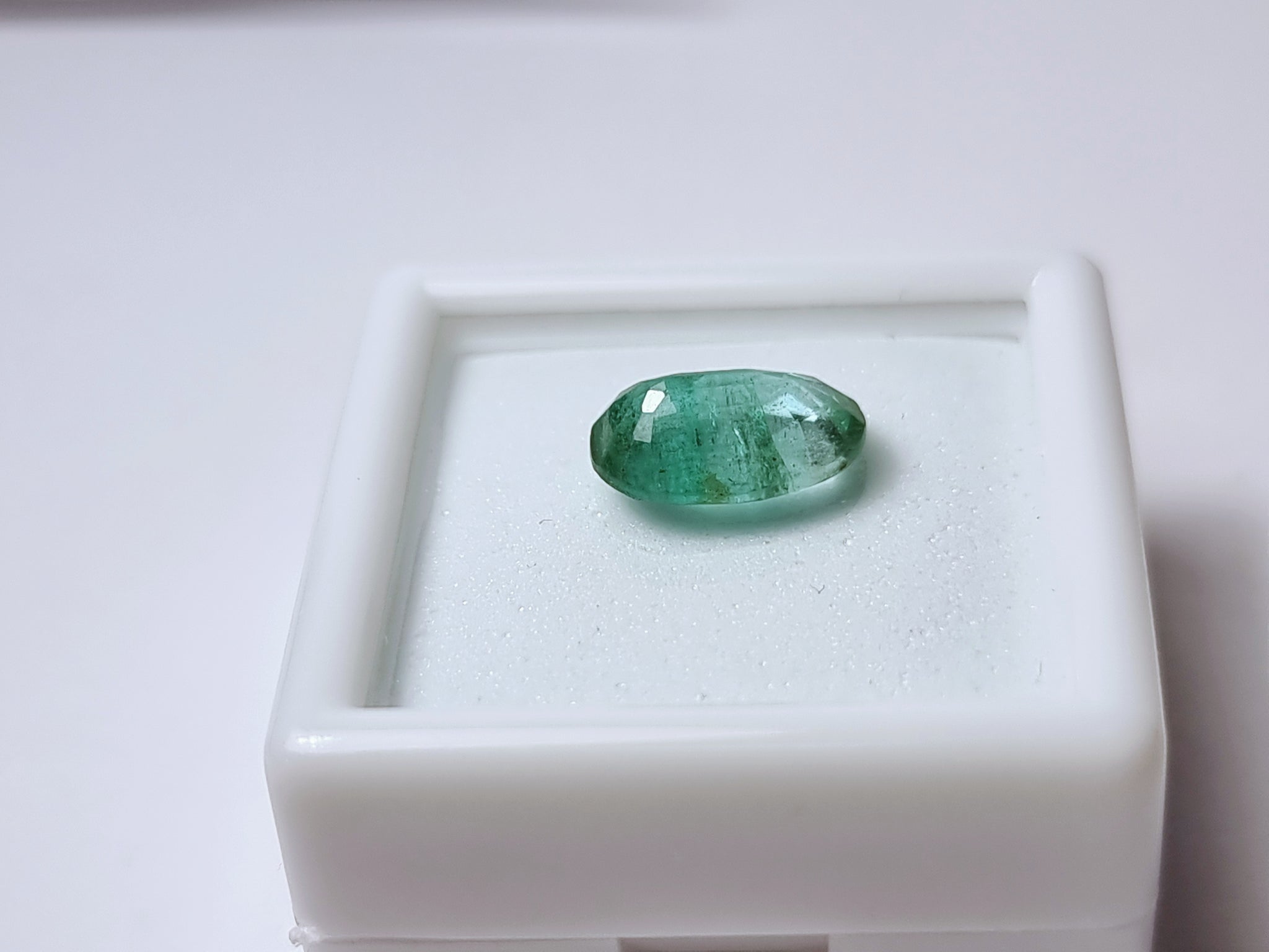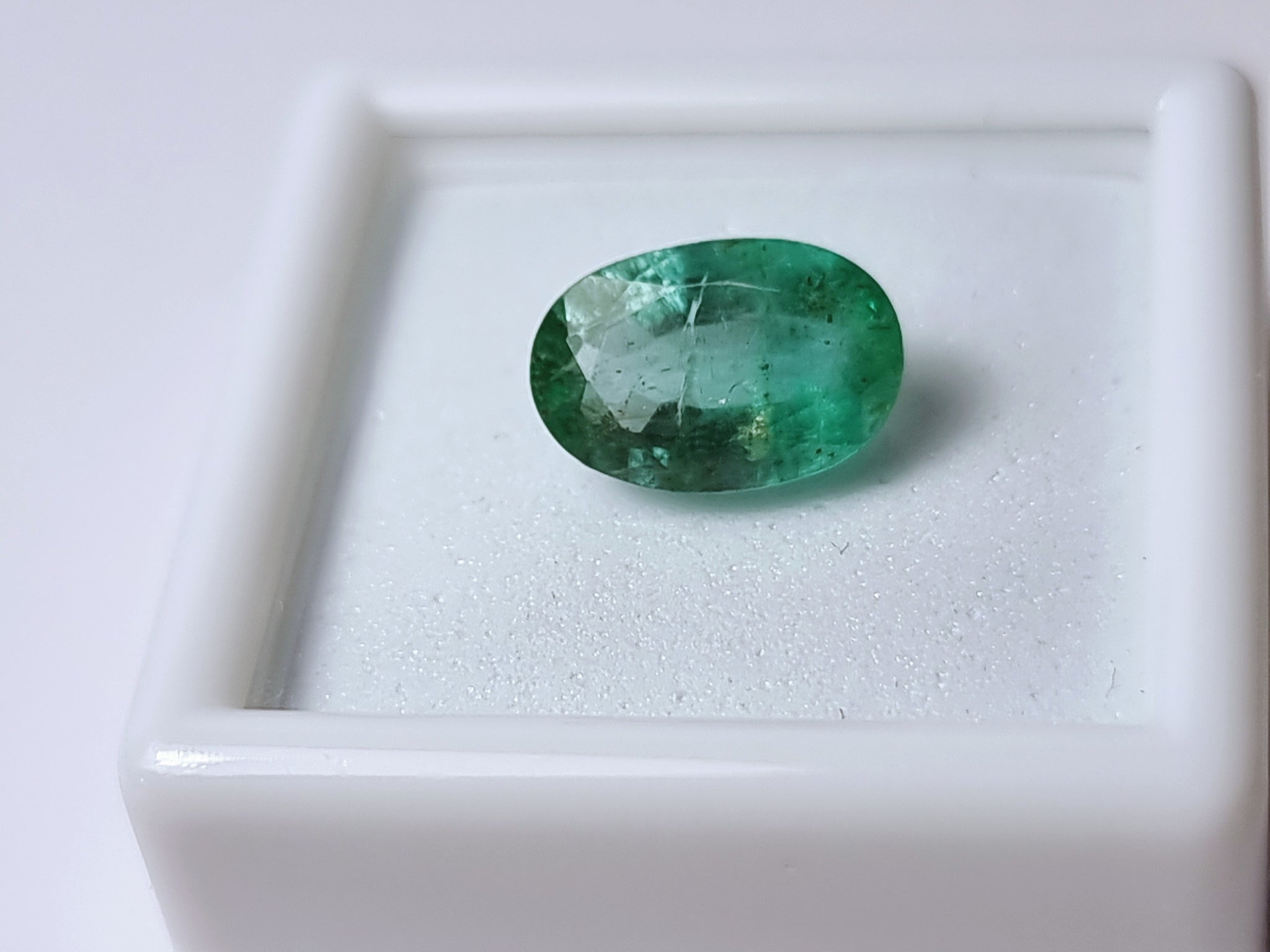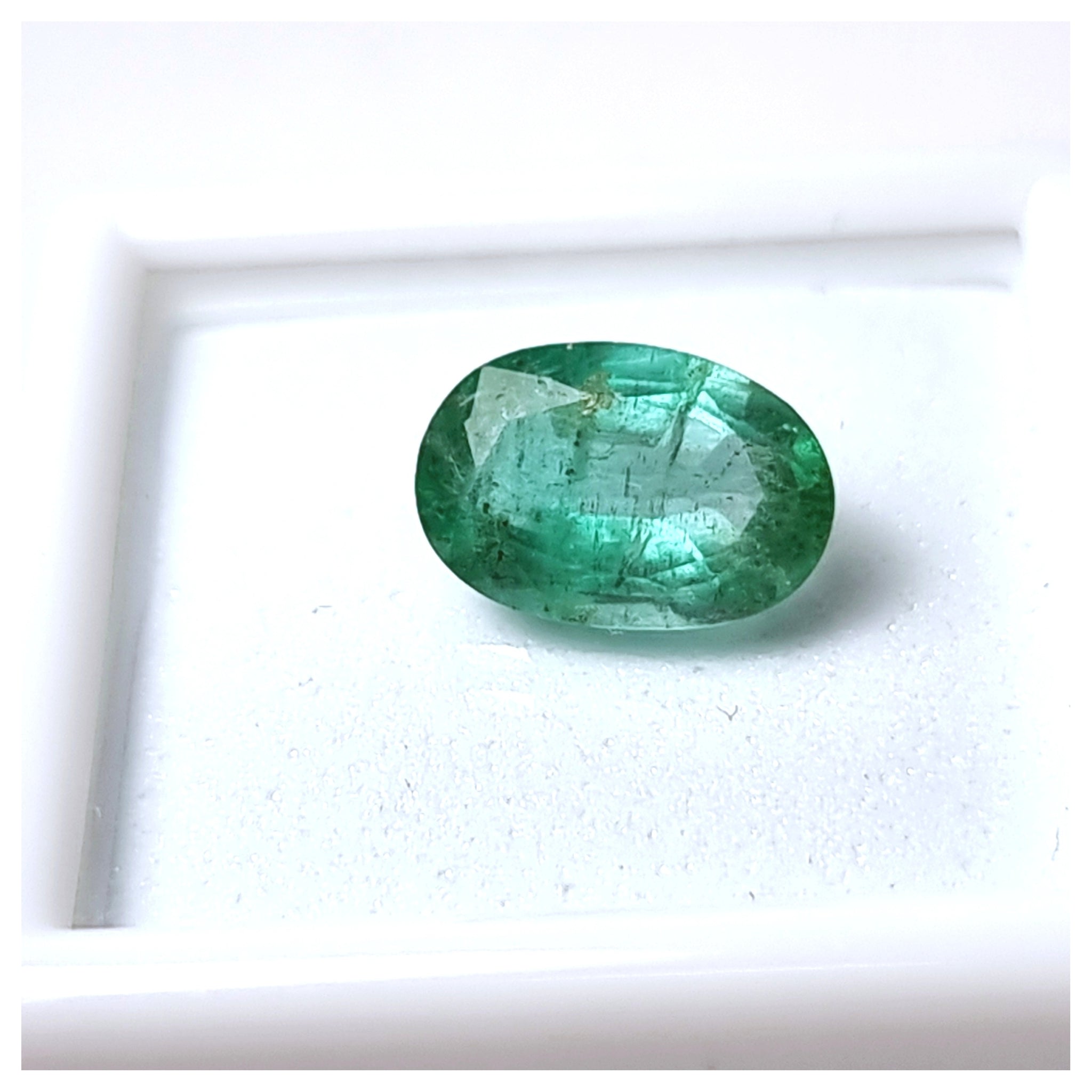 Esmeralda con interesantes inclusiones, buen color, transparencia y brillo Origen: Zambia Tratamiento: Aceite Tallado y pulido en Barcelona Talla: Facetada oval irregular Medida: 10'00x6'80x3'85mm