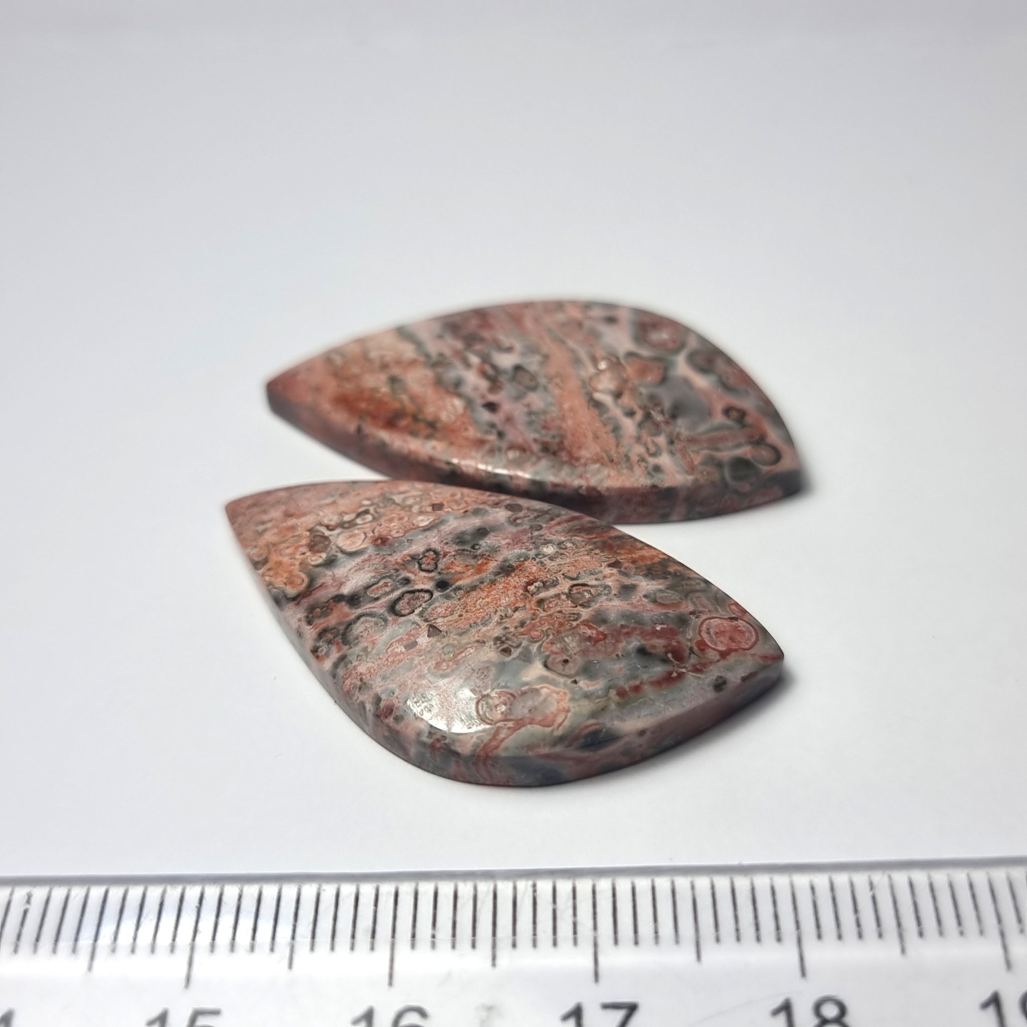 Jaspe con un dibujo único y espectacular Origen: Madagascar Tallado y pulido en Barcelona Talla: Cabujón cometa irregular Medida: 35x18x5mm Precio unitario Unidades disponibles: 2