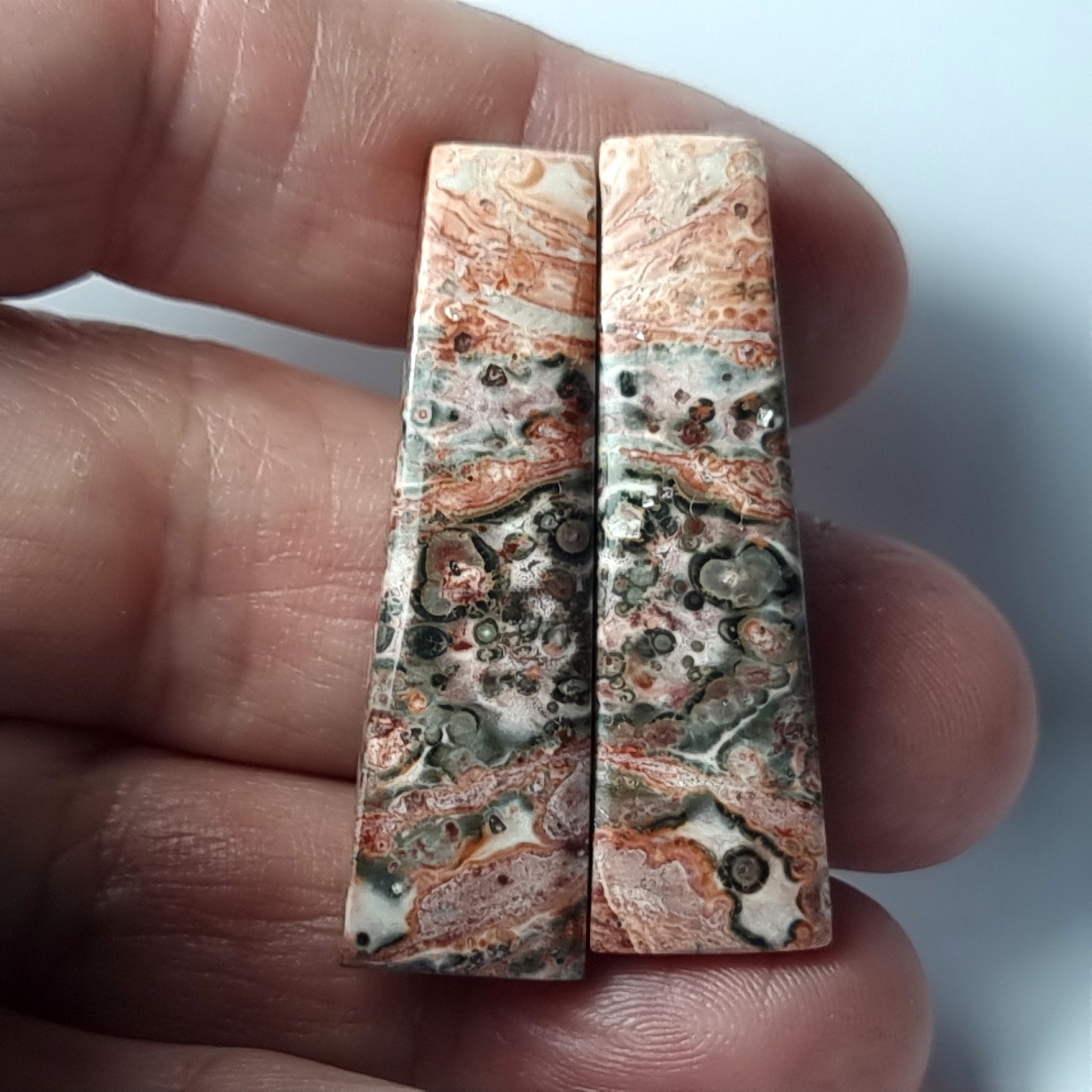 Pareja de Jaspe con un dibujo único y espectacular Origen: Madagascar Tallado y pulido en Barcelona Talla: Cabujón rectangular Medida: 40x12x4'60mm Precio unitario Unidades disponibles: 2