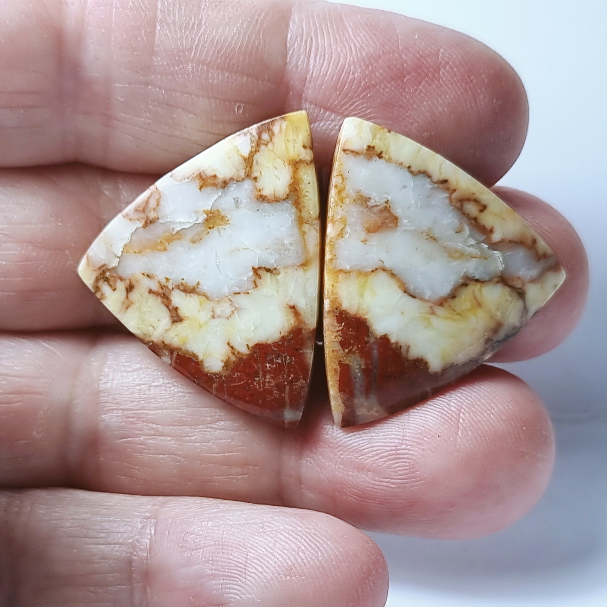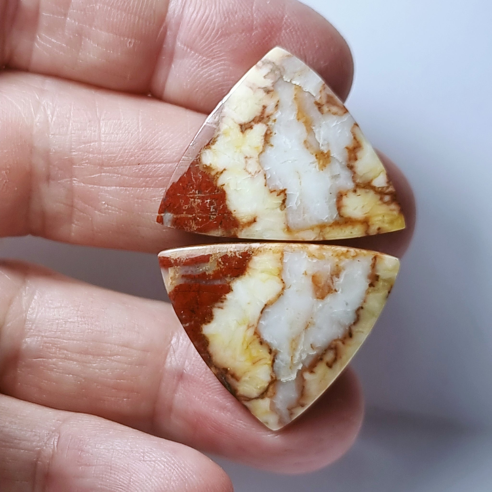 Jaspe con bonitos dibujos multicolorOrigen: SudáfricaTallado y pulido en BarcelonaTalla: Cabujón cometaMedida: 28'50×25'65×3'50mmPrecio unitarioCantidad disponible: 2