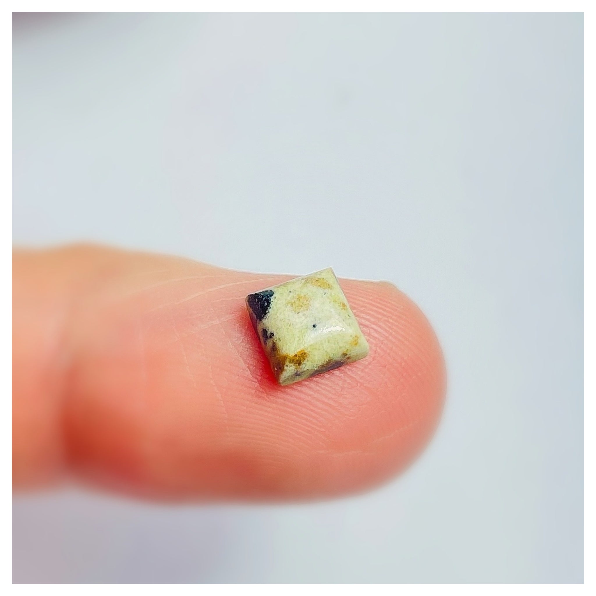 Jaspe Dálmata con bonito estampado.Origen: MéxicoTallado y pulido en BarcelonaTalla: Cabujón cuadradoMedida: 6 x 6 x 3 mm
