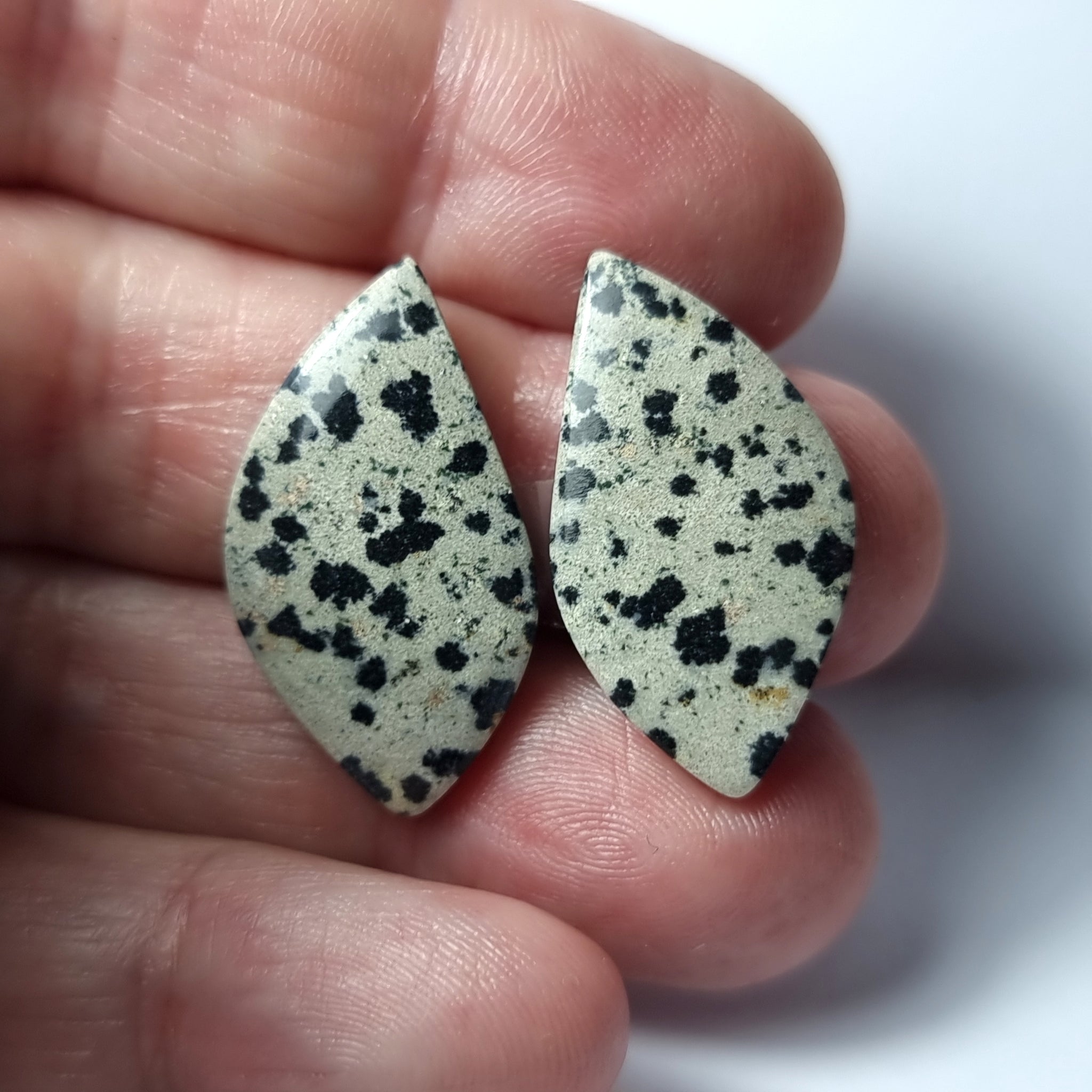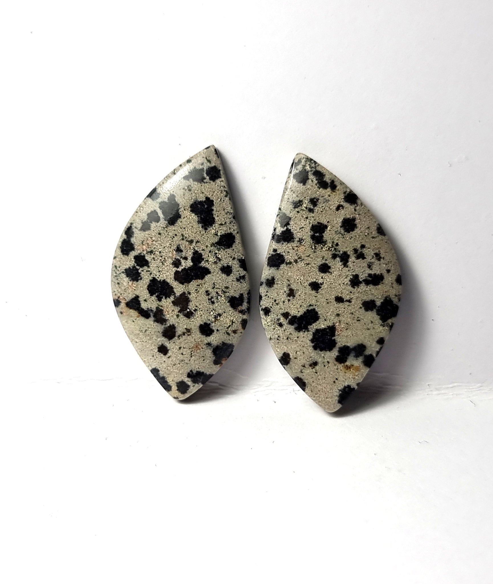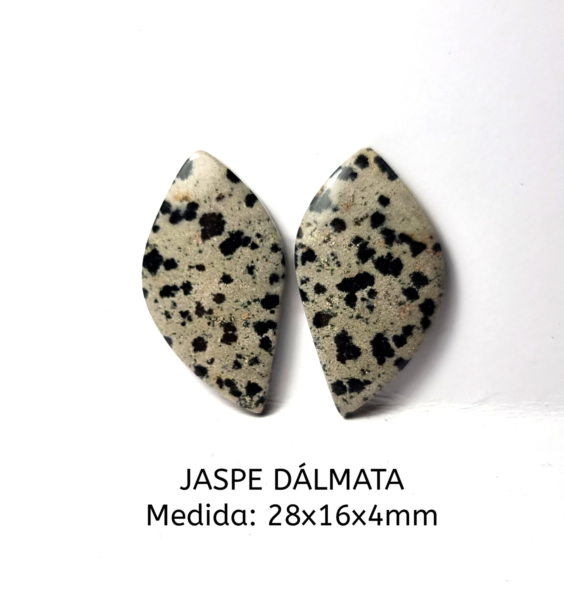 Jaspe Dálmata. Excelente pulido y colorOrigen: MéxicoTallado y pulido en BarcelonaTalla: Cabujón cometa irregularMedida: 28x16x4mmPrecio unitario