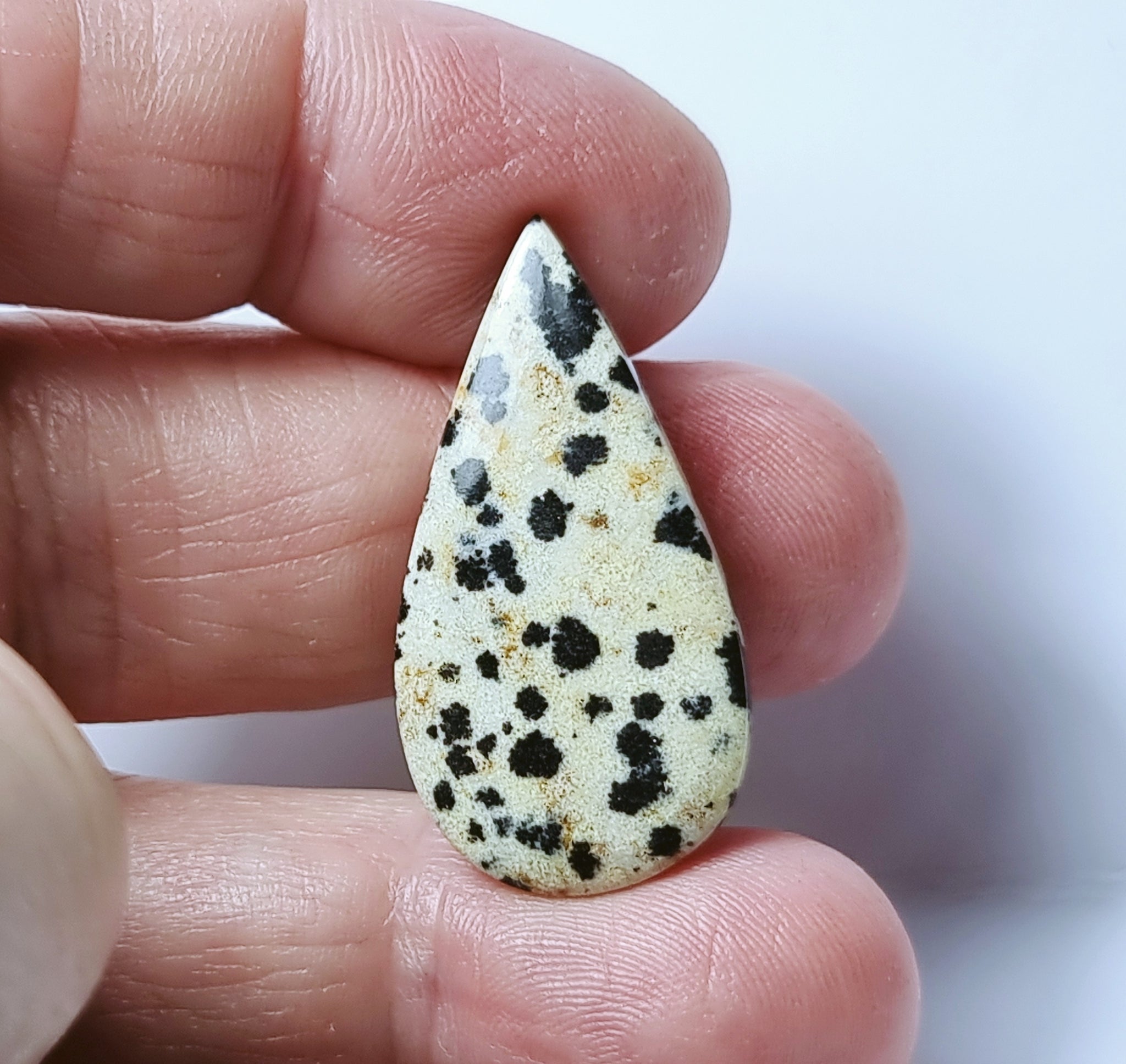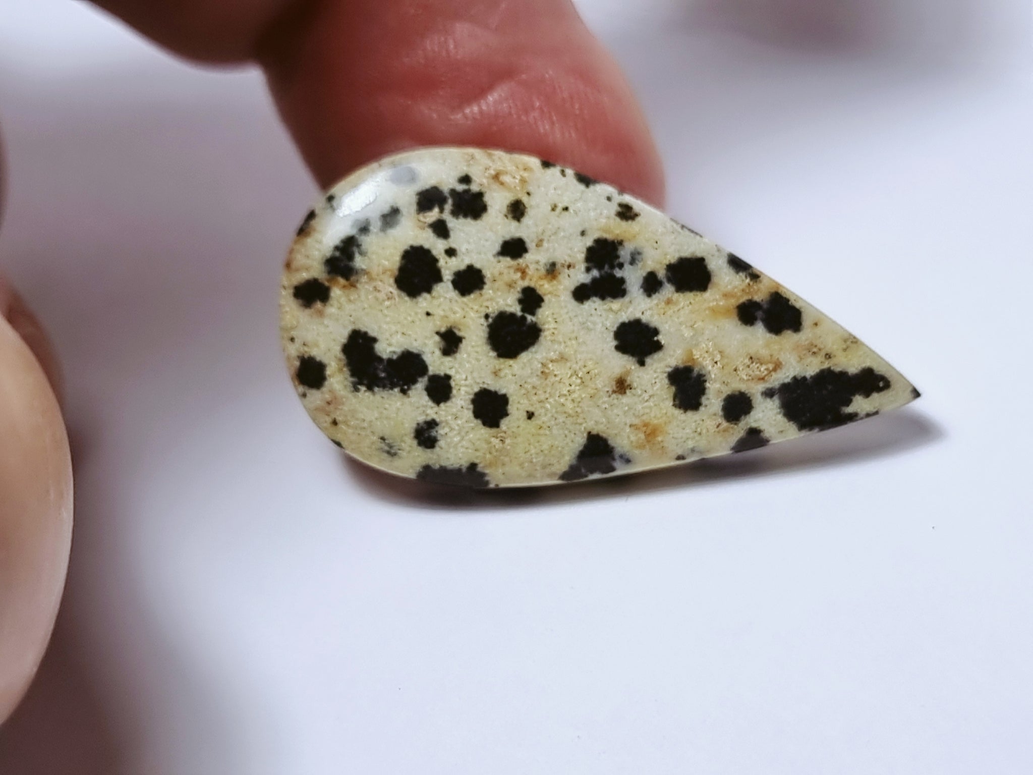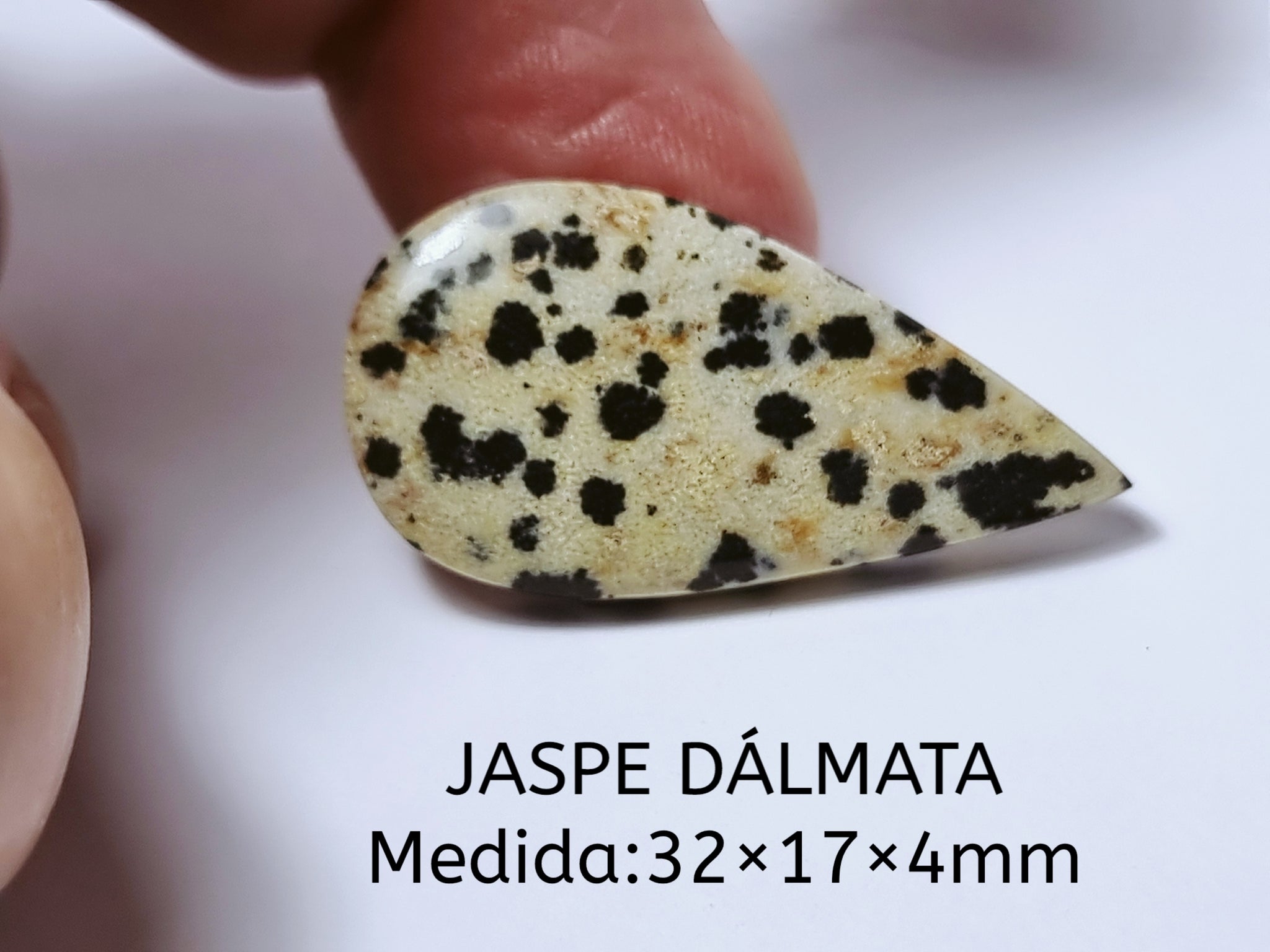 Bonito Jaspe Dálmata con un bonito dibujo Origen: México Tallado y pulido en Barcelona Talla: Cabujón pera Medida: 32x17x4mm Precio unitario Cantidad disponible: 2
