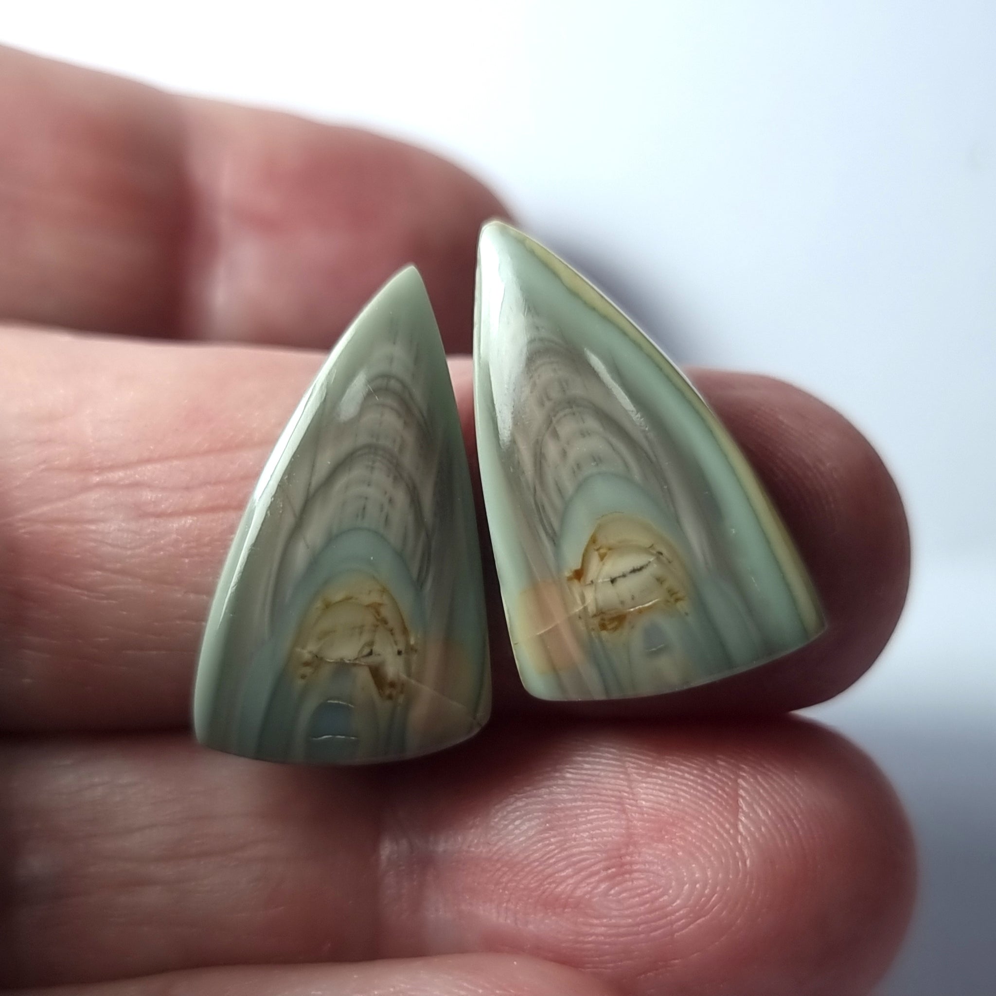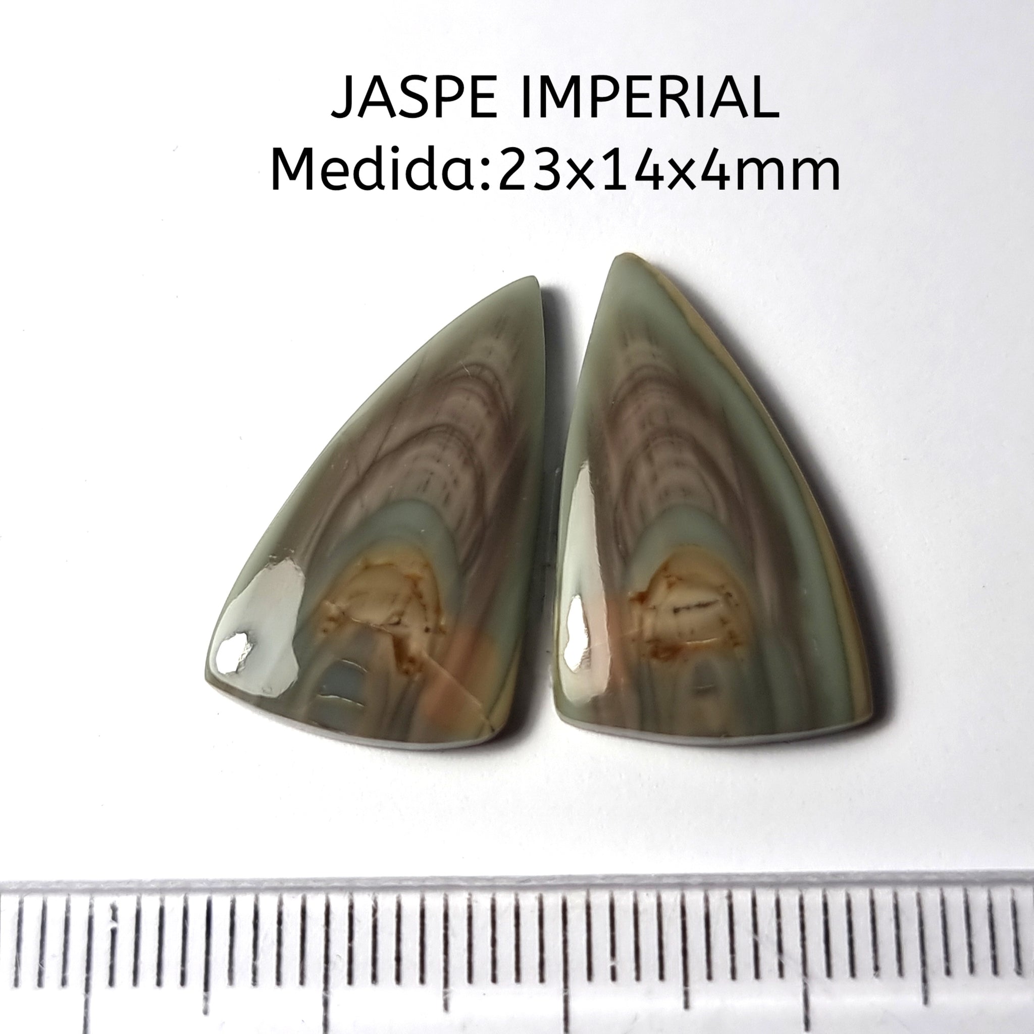 Bonita pareja de Jaspe Imperial con un bonito dibujo y pulido muy fino Origen: México Tallado y pulido en Barcelona Talla: Cabujón triángulo irregular Medida: 23x14x4mm