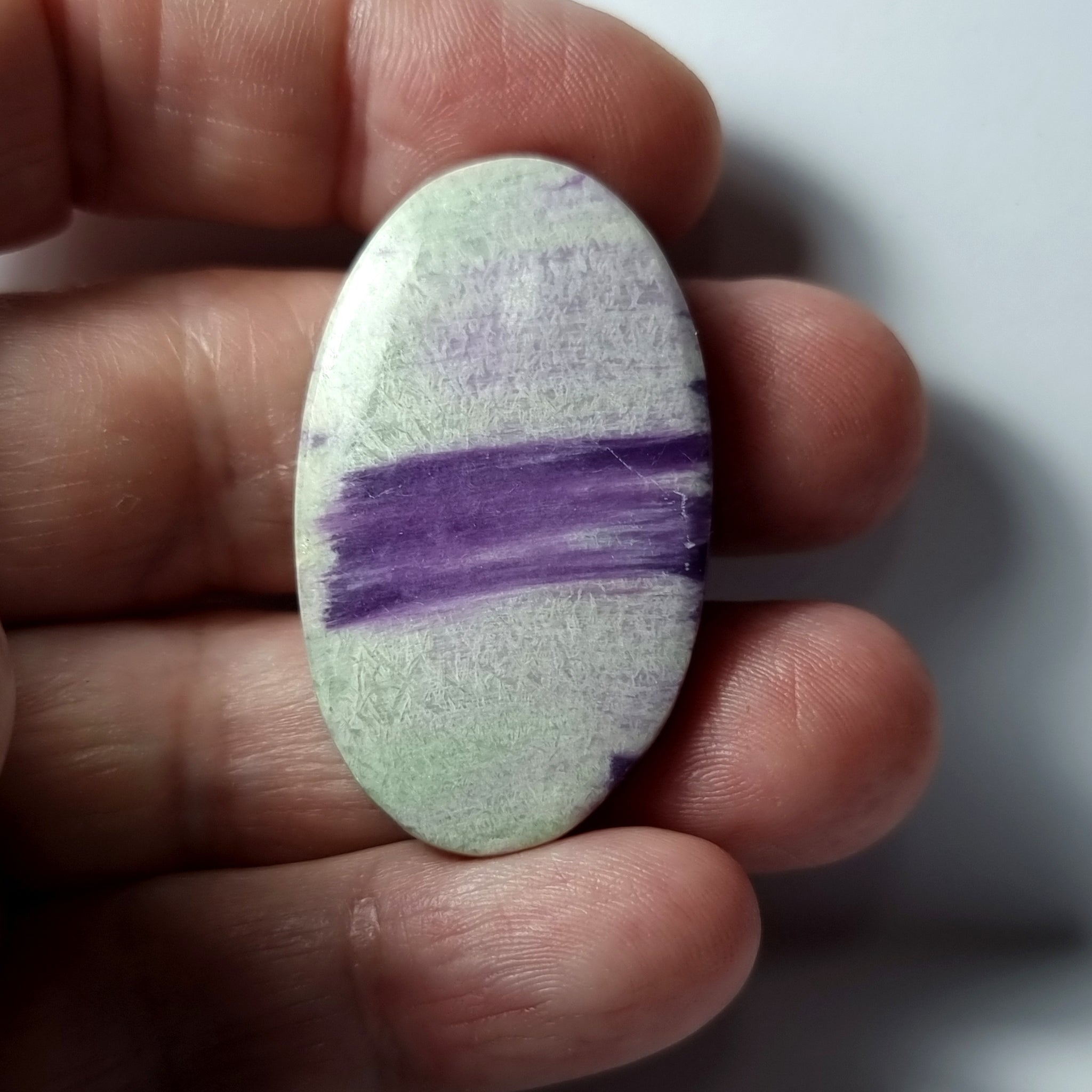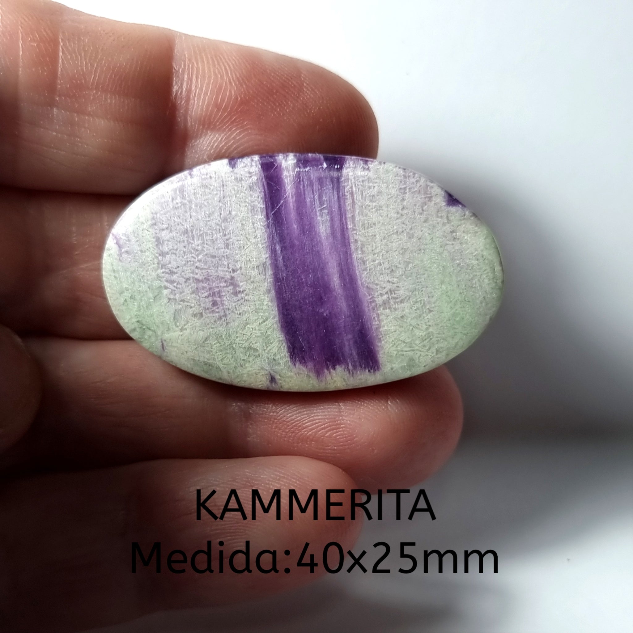 Kammerita espectacular, con un curioso dibujo parecido a una pincelada Origen: Noruega Tallado y pulido en Barcelona Talla: Cabujón oval Medida: 40x25x5mm