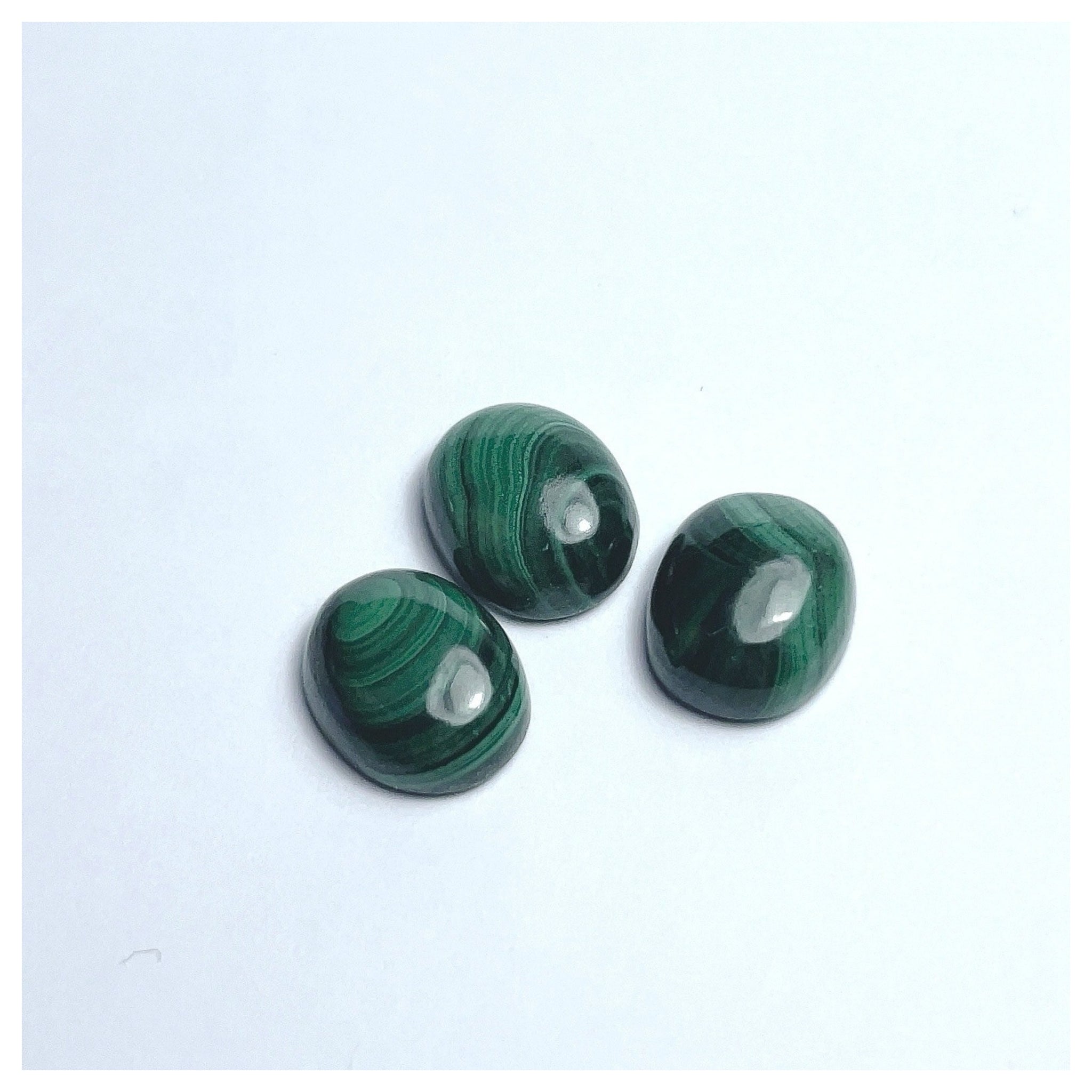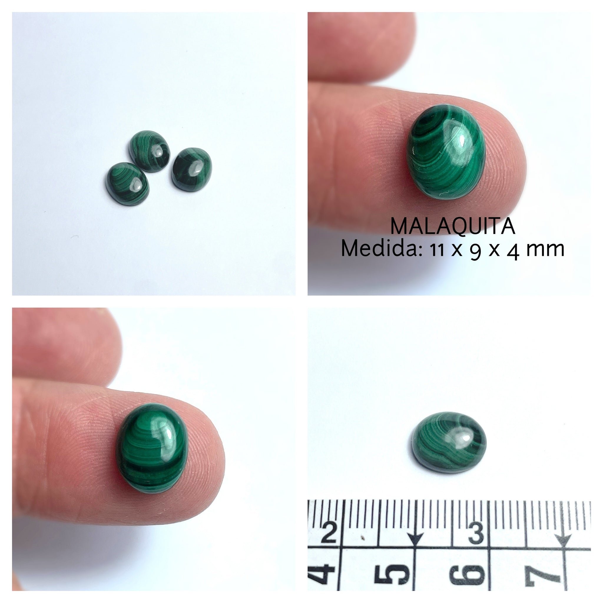 Bonita malaquita con distintas tonalidades de verde. Origen: Sudáfrica Tallado y pulido en Barcelona Talla: Cabujón oval Medida: 11 x 9 x 4 mm Precio unitario Cantidad disponible: 3