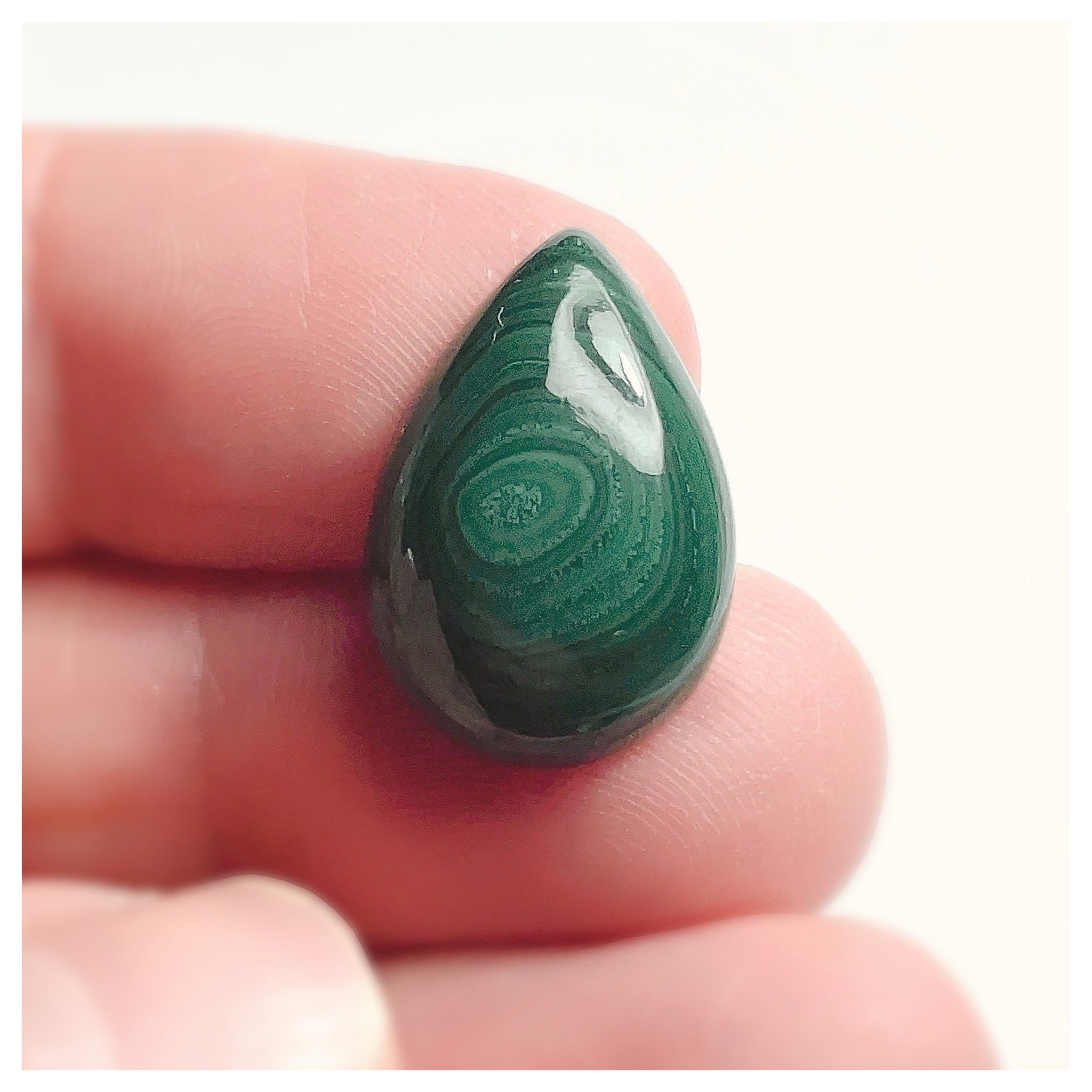 Bonita malaquita con distintas tonalidades de verde.Origen: SudáfricaTallado y pulido en BarcelonaTalla: Cabujón peraMedida: 20 x 14 x 6 mm