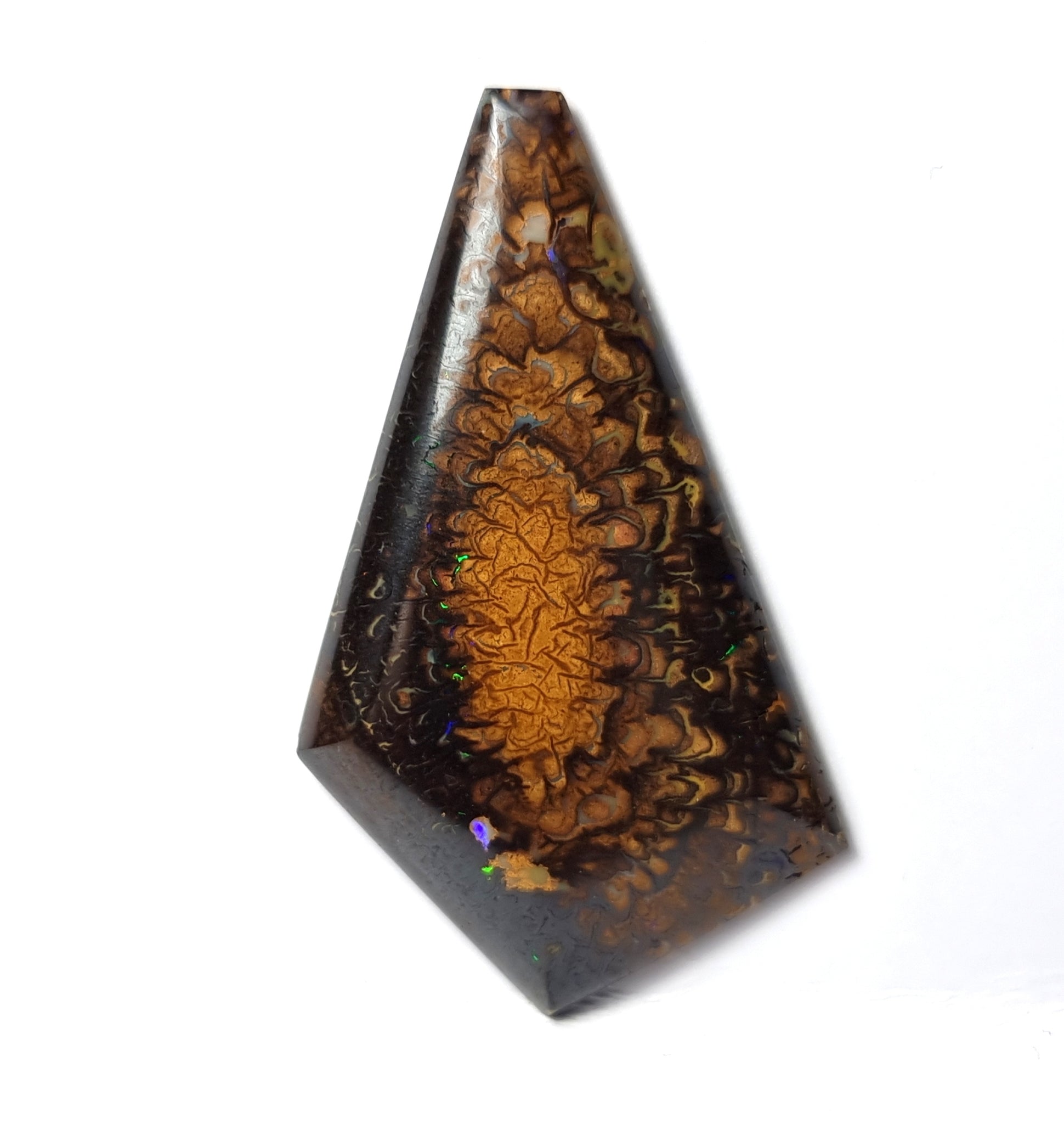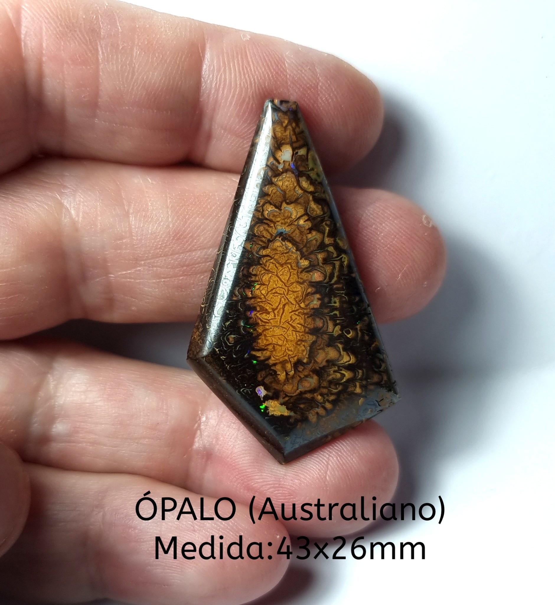 Ópalo Australiano con un original dibujoOrigen: AustraliaTallado y pulido en BarcelonaTalla: Cabujón cometa fancyMedida: 46x26mm