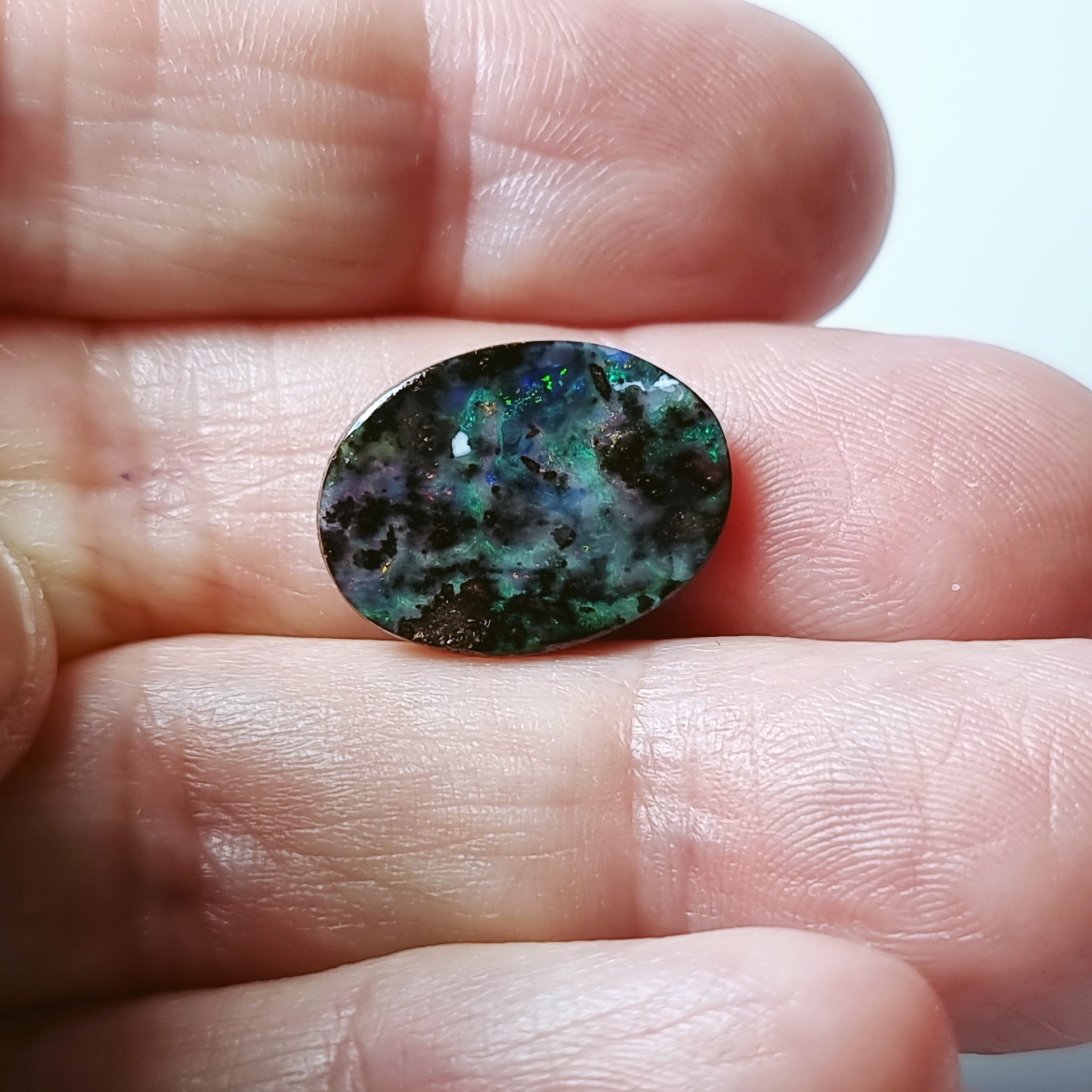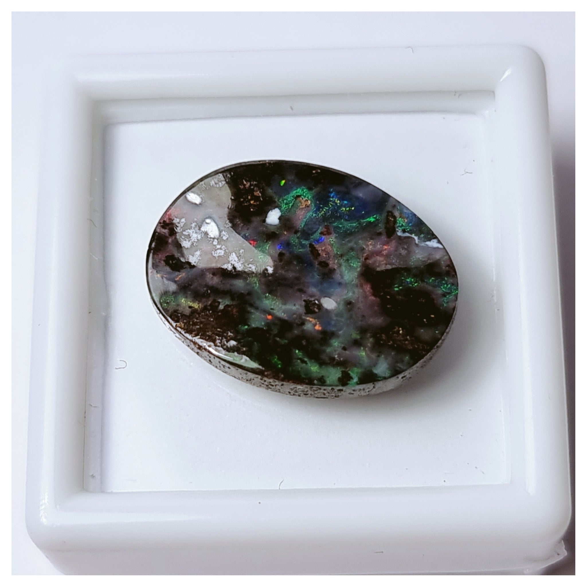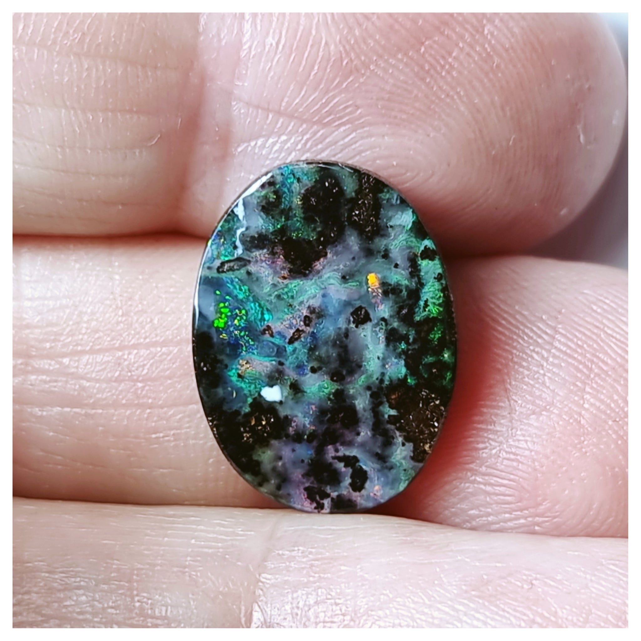 Original Ópalo Australiano con brillos de colores verde, lila y azul en movimiento Origen: Australia Tallado y pulido en Barcelona Talla: Cabujón oval Medida: 17x13x4mm