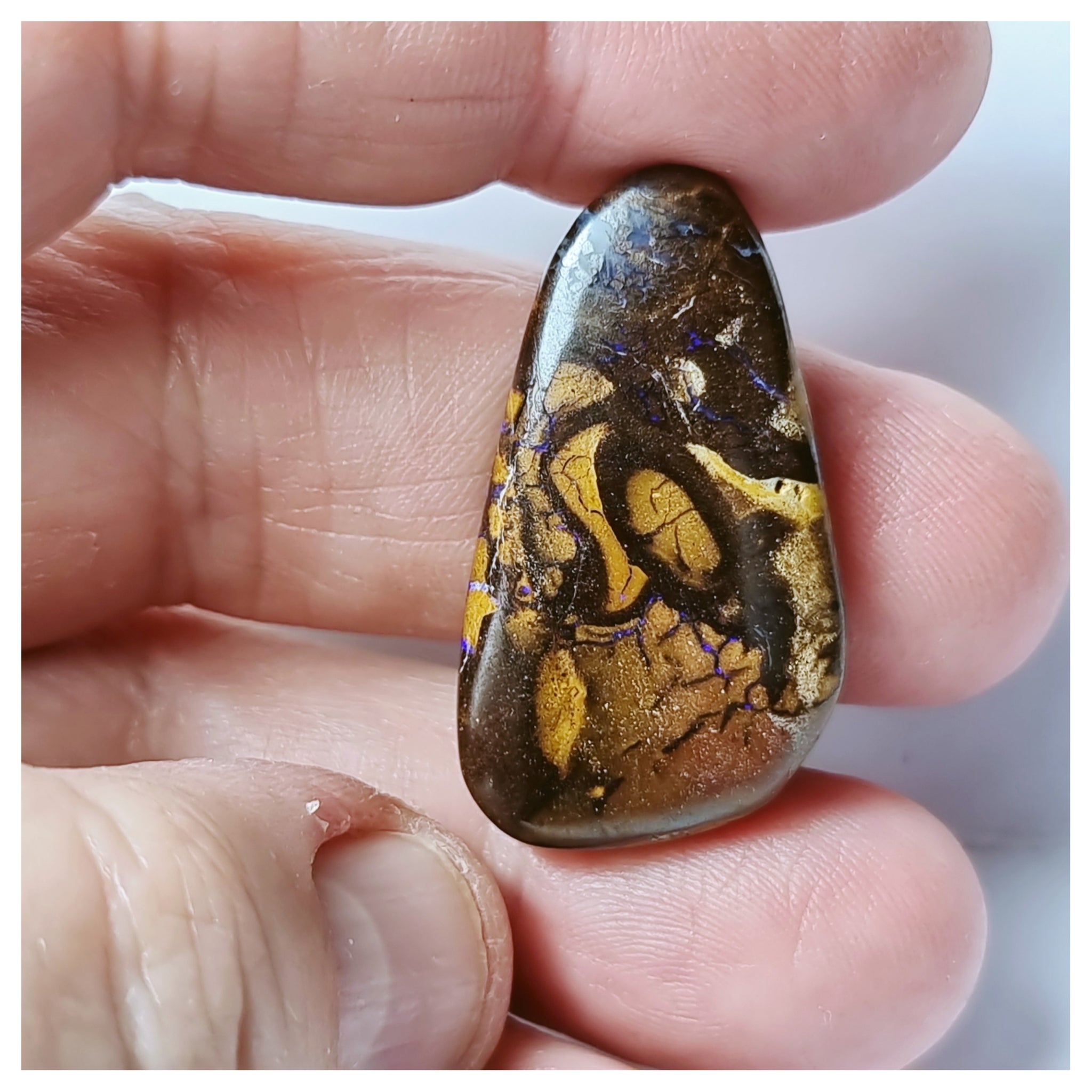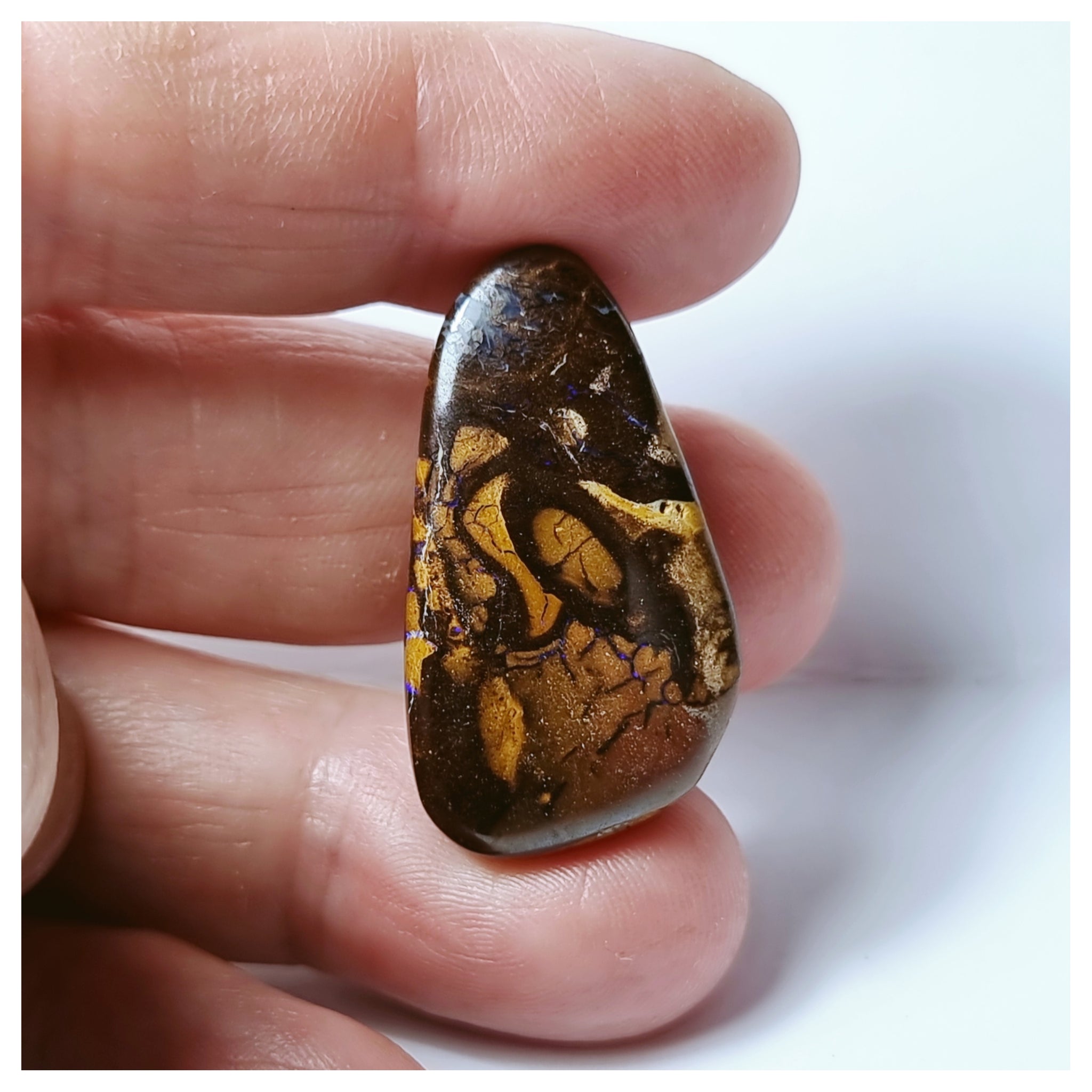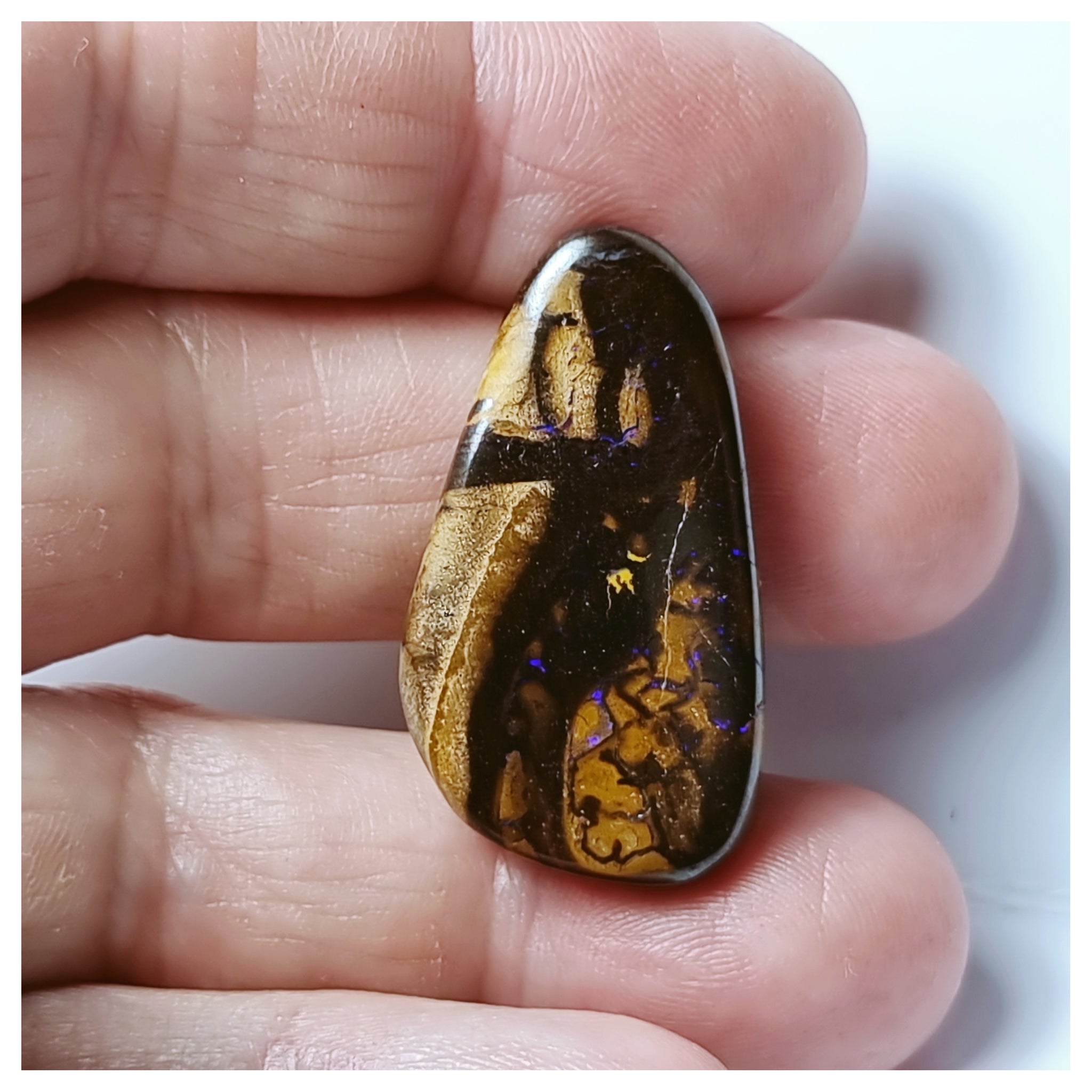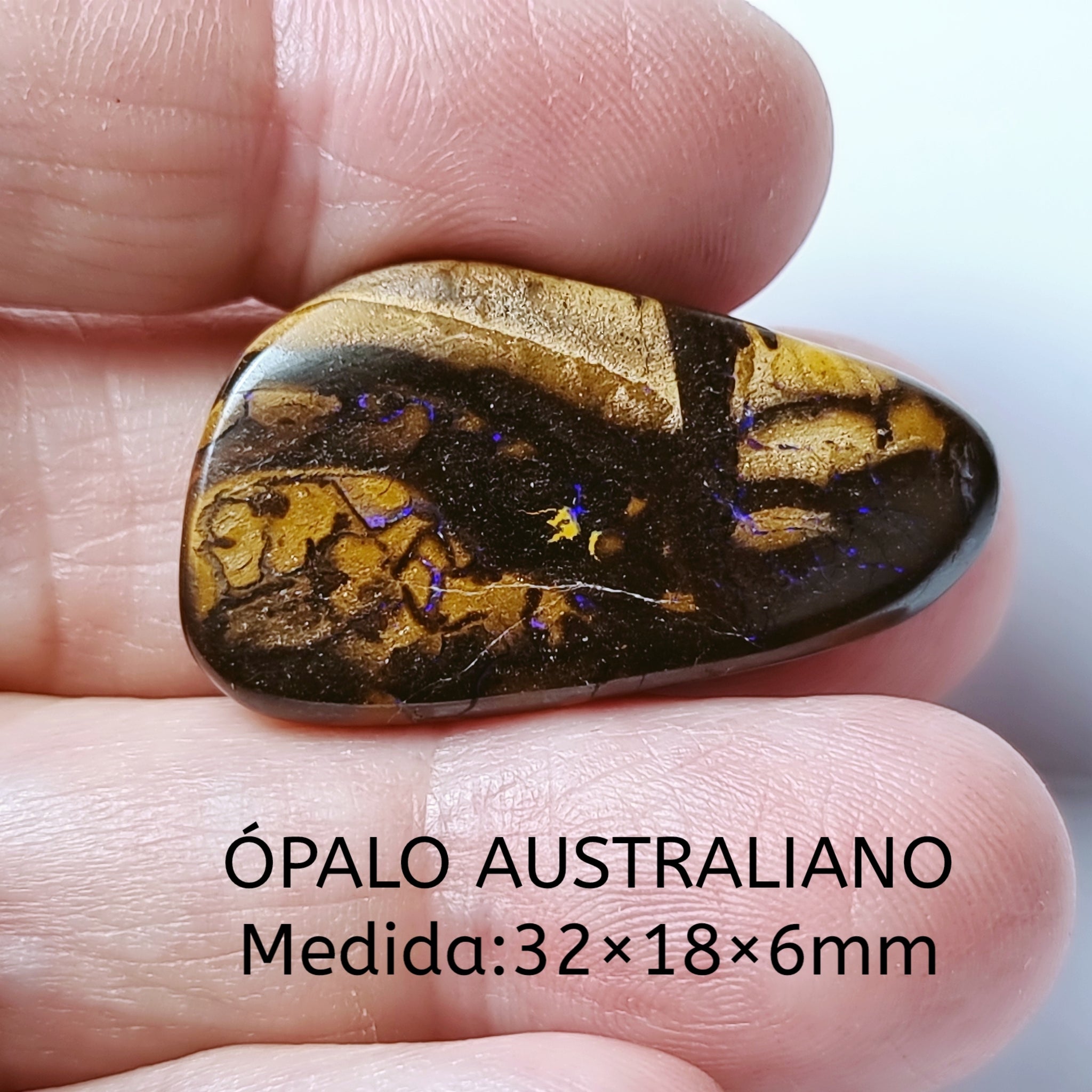 Original Ópalo Australiano con un bonito dibujo. Chispas de azul/lila en movimiento Origen: Australia Tallado y pulido en Barcelona Talla: Cabujón fancy Medida: 32x18x6mm