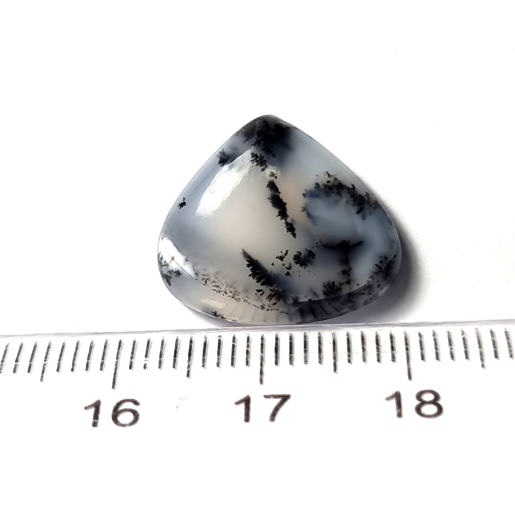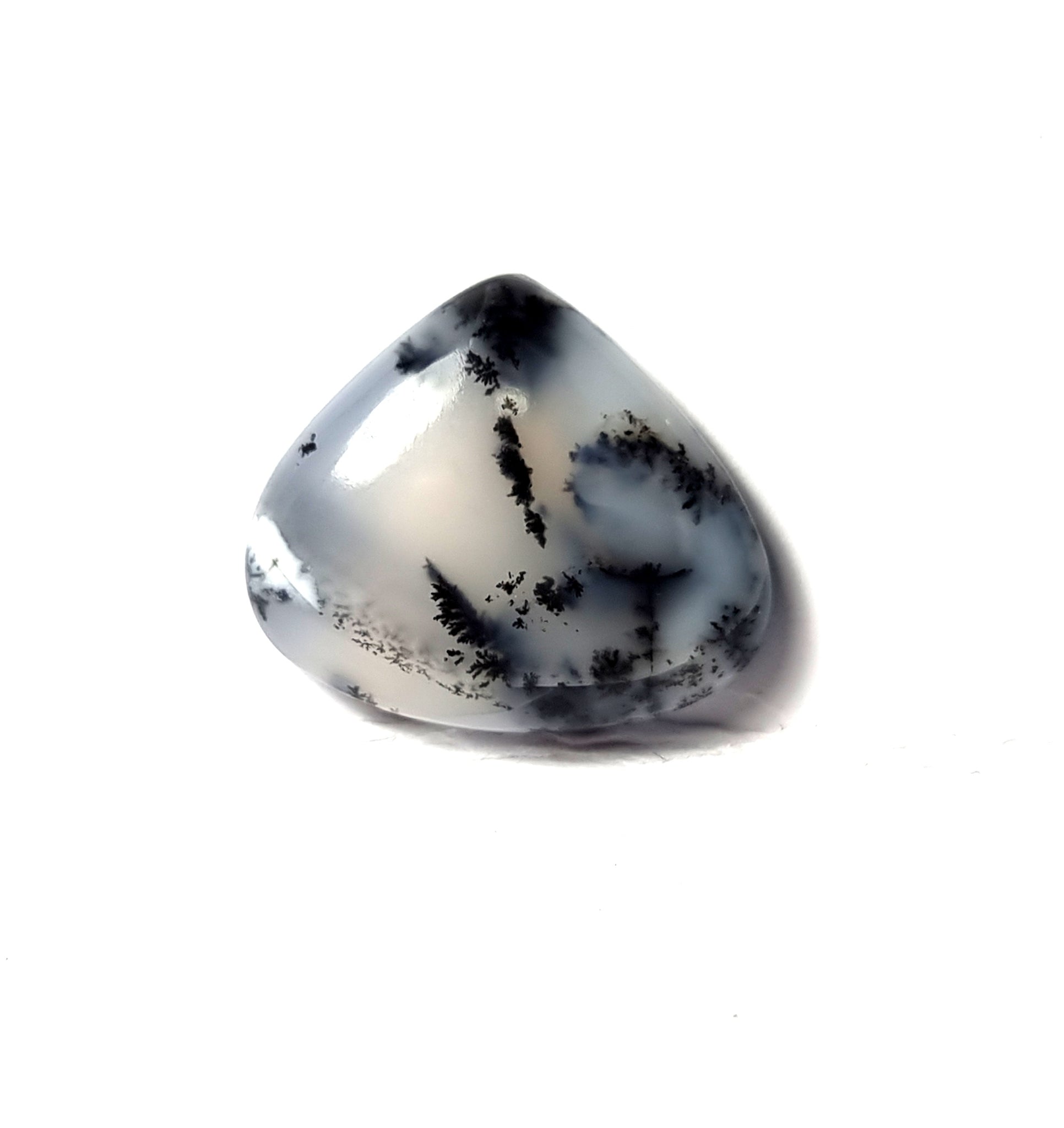 Ópalo dendrítico con un curioso y original dibujo. Origen: México Tallado y pulido en Barcelona Talla: Cabujón corazón irregular Medida: 17'40x15x4'5mm