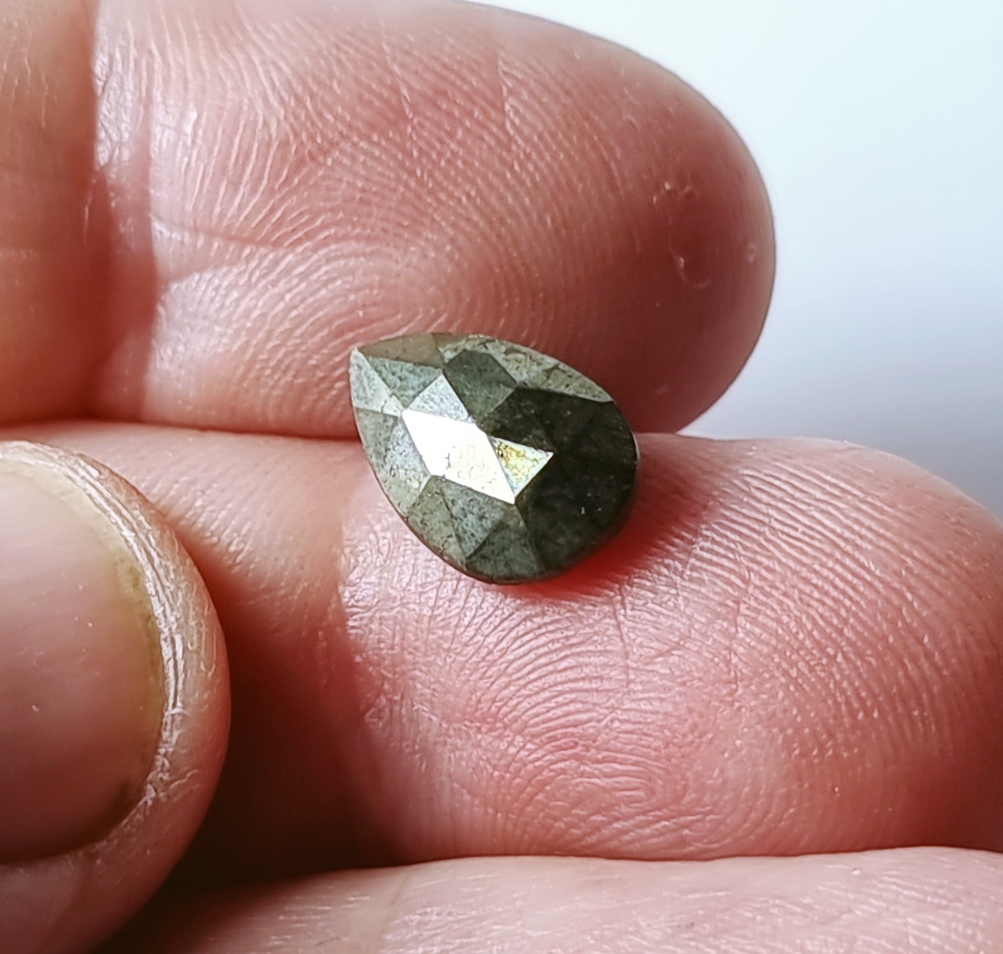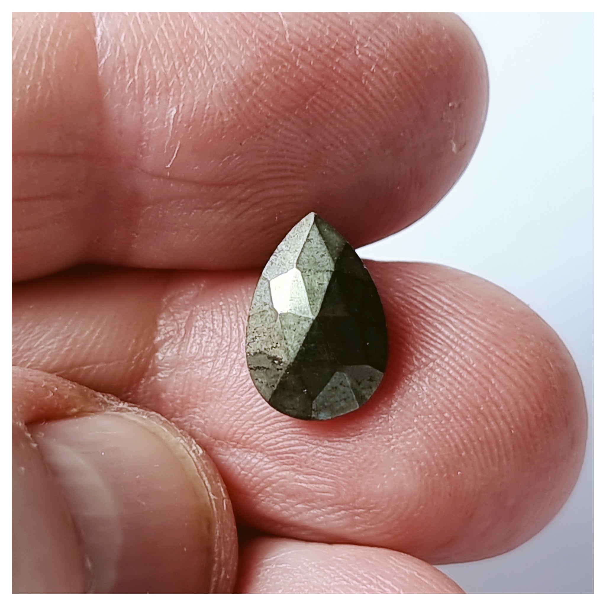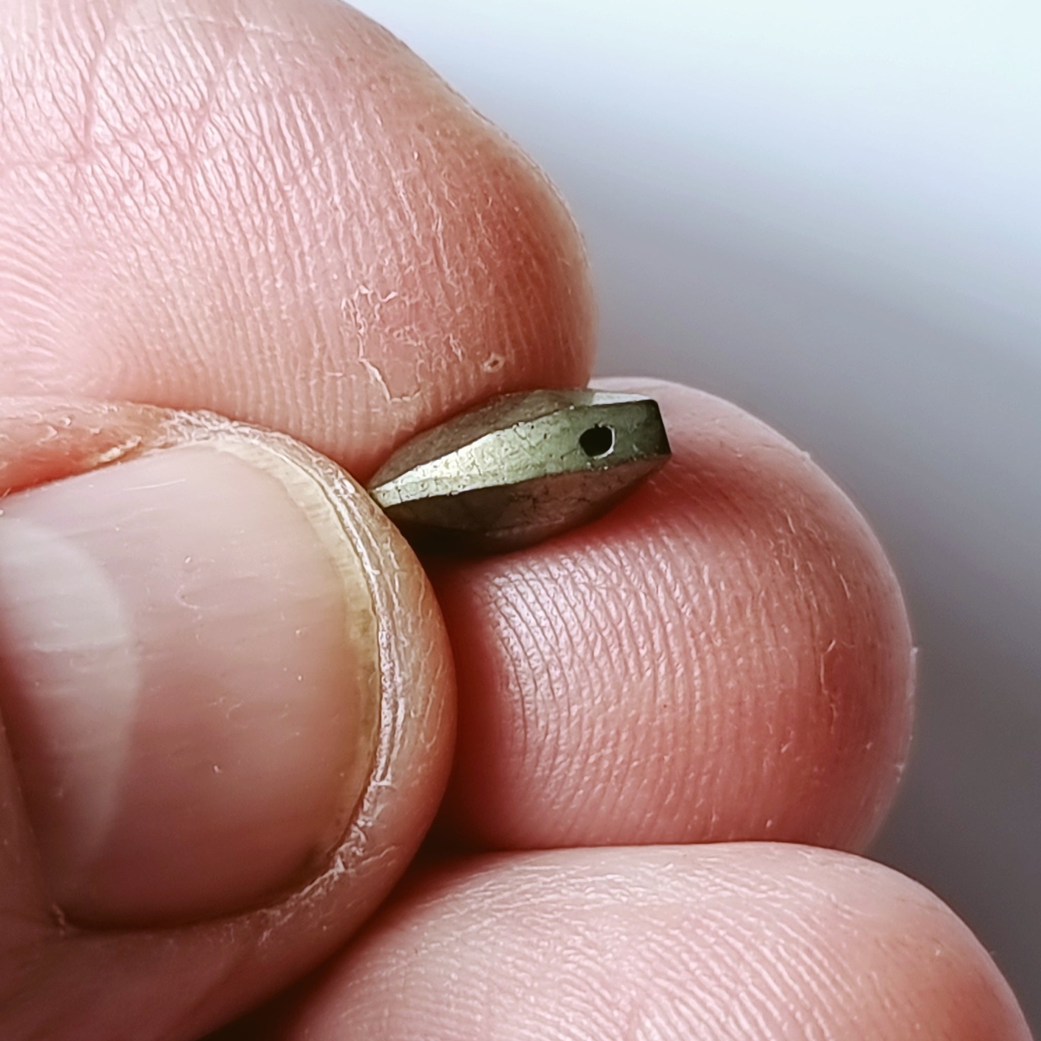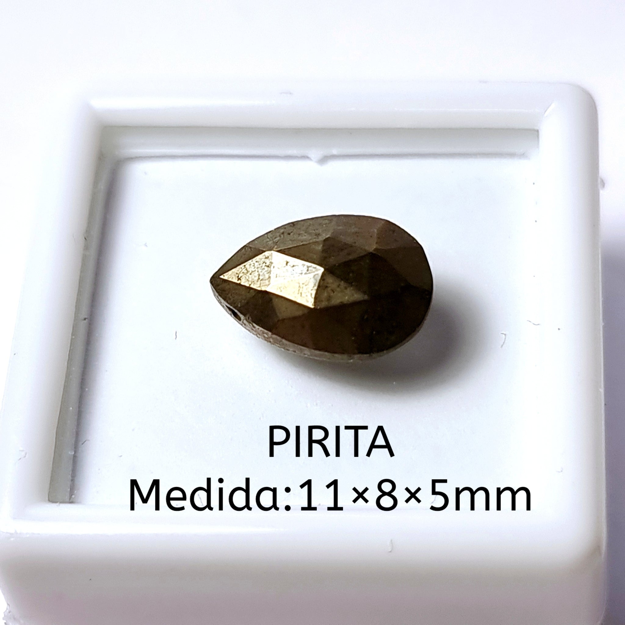 Bonita Pirita perforadaOrigen: PerúTallado y pulido en BarcelonaTalla: Facetado lágrima doble brioletteMedida: 11×8×5mm