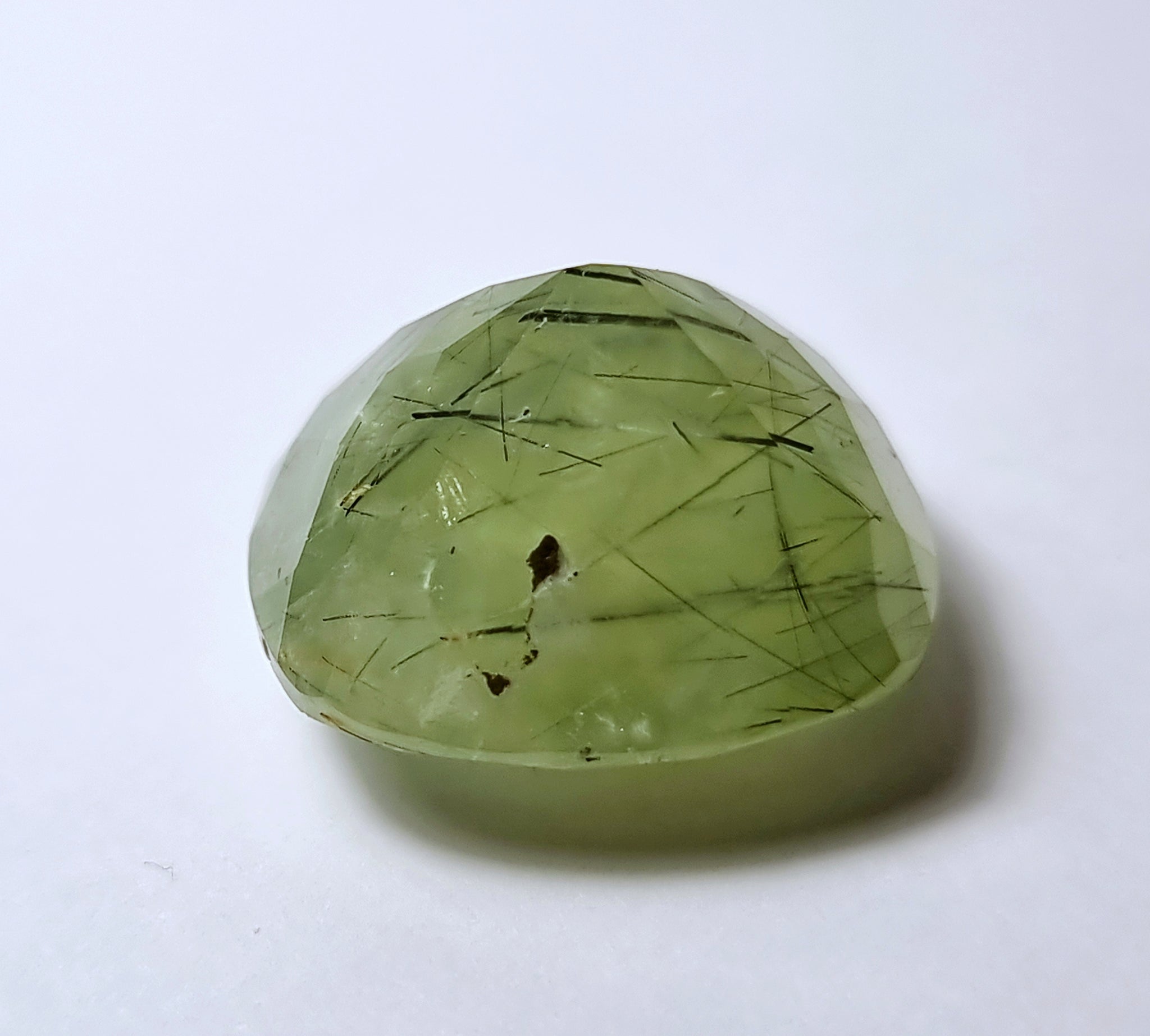 Fantástico Prehnite verde claro con rutil verde Origen: Sudáfrica Tallado y pulido en Barcelona Talla: Facetada cojín briolette Medida: 22'6x20'5x15'7mm