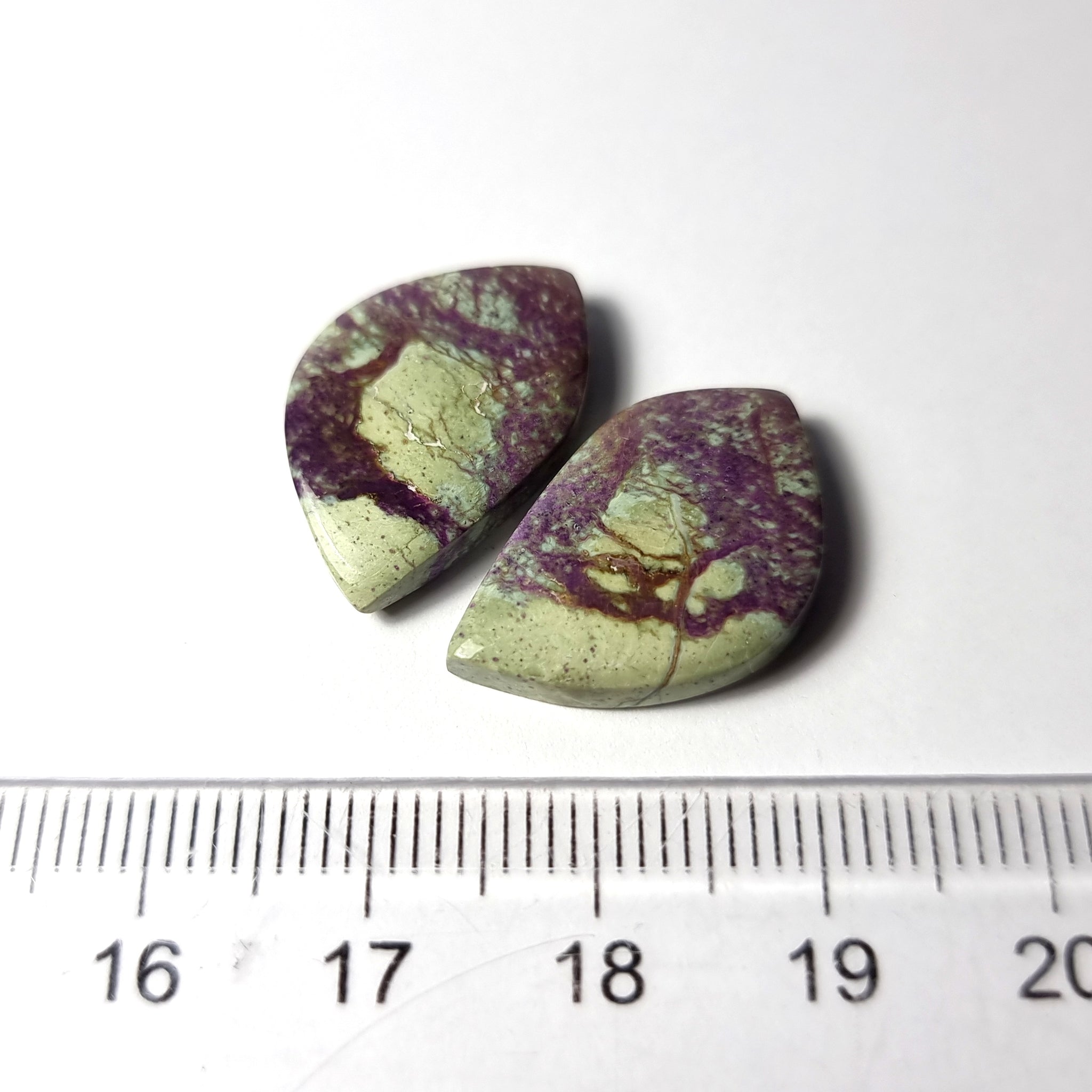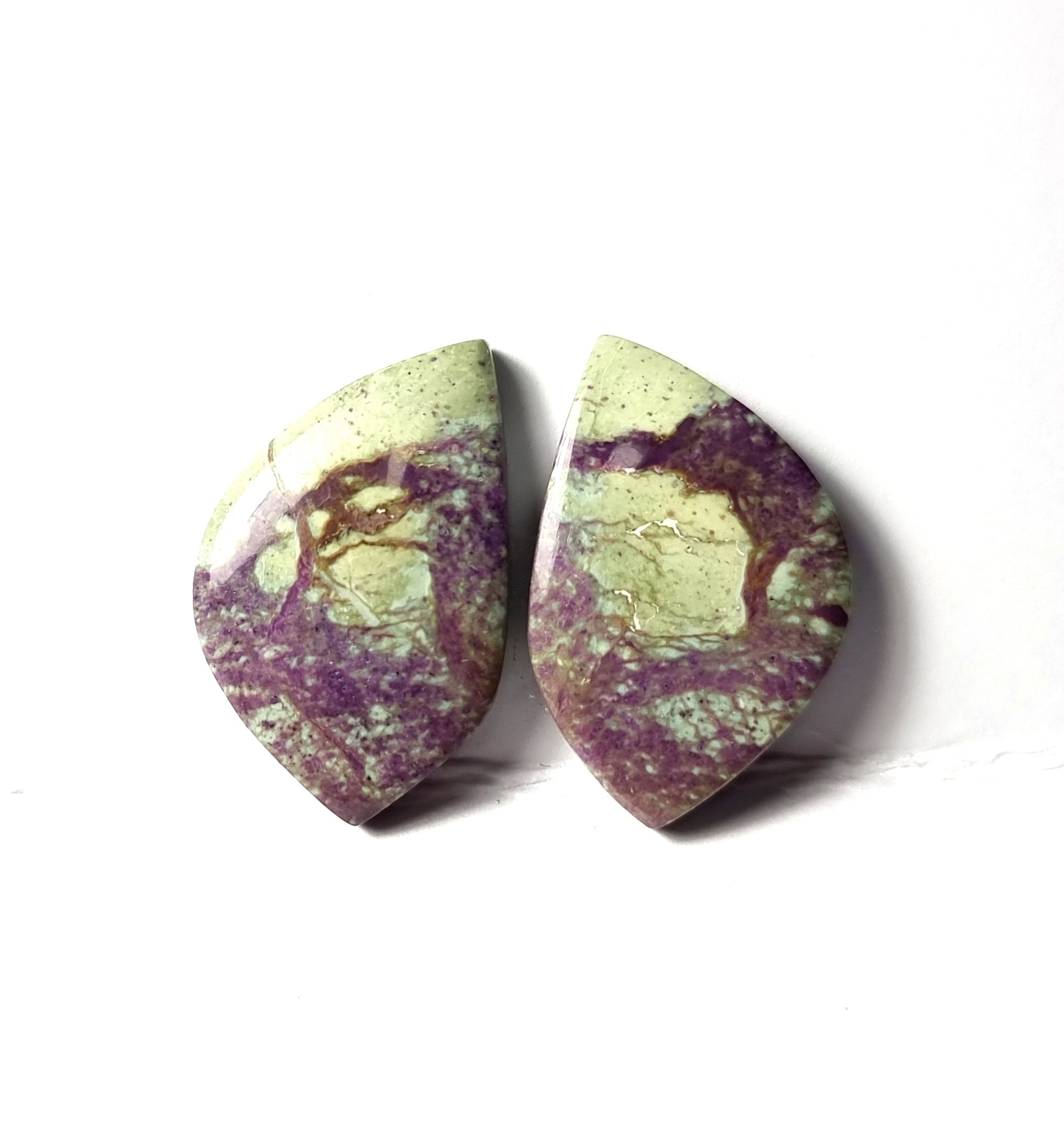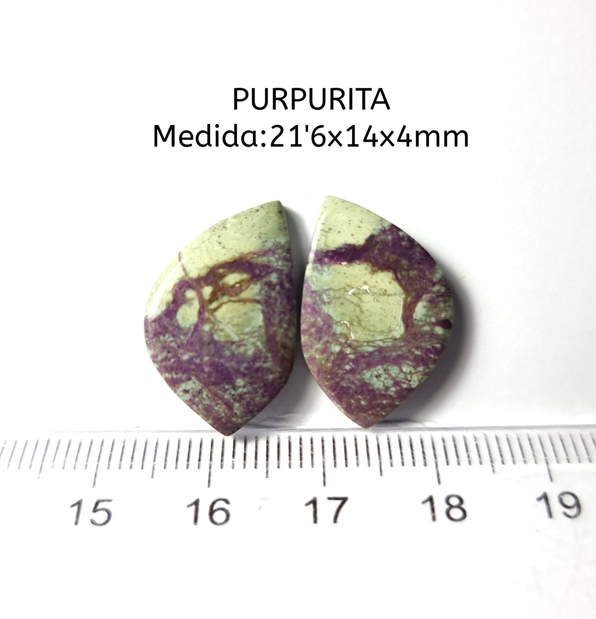 Purpurita con un bonito dibujo púrpura y verde claro Origen: Namibia Tallado y pulido en Barcelona Talla: Cabujón cometa irregular Medida: 21'6x14x4mm Precio unitario Cantidad disponible: 2