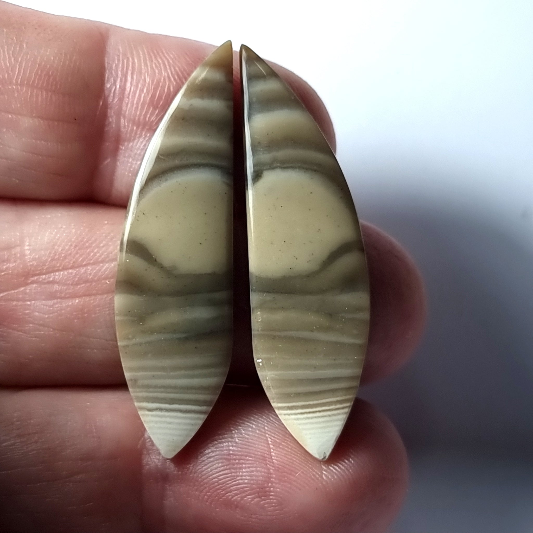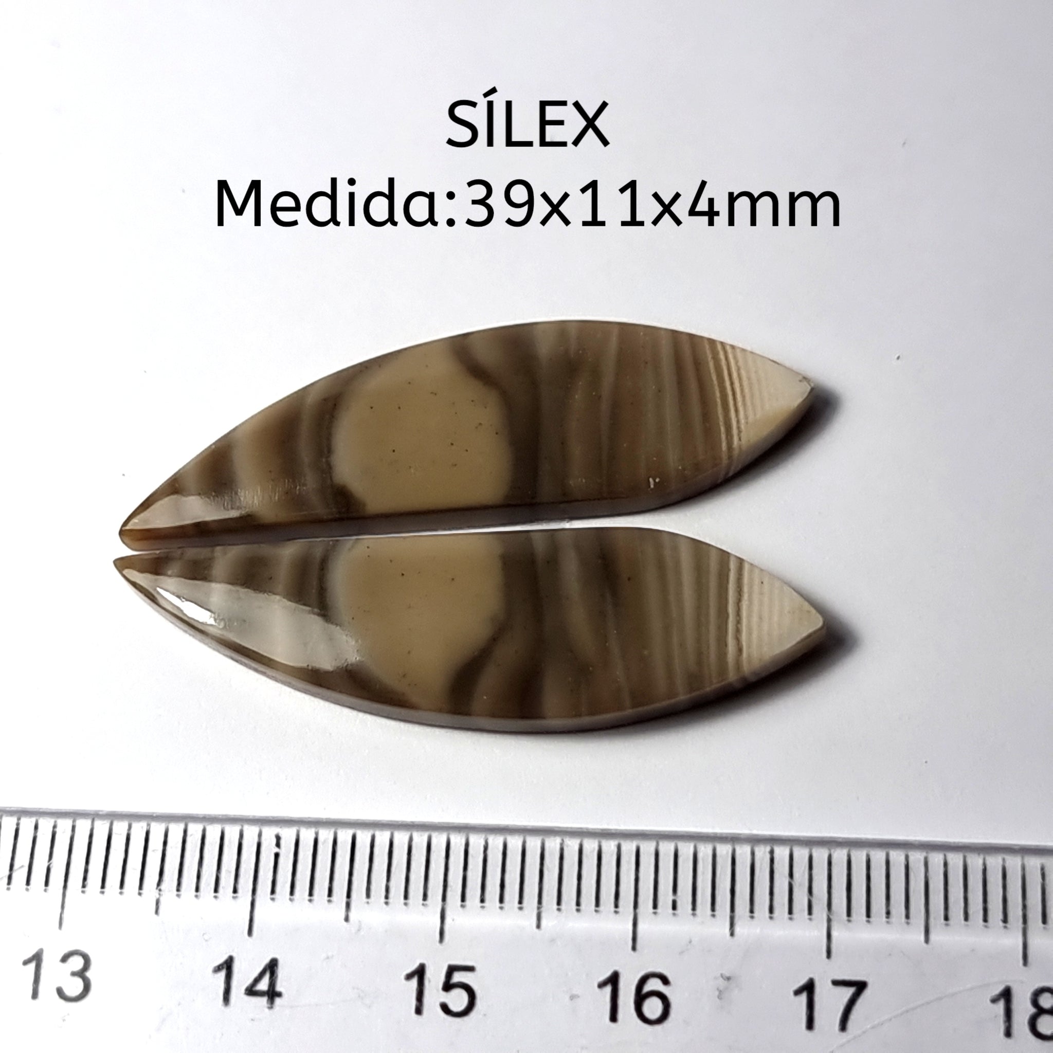 Pareja de Sílex con bonitos dibujos en tonos marrónOrigen: SudáfricaTallado y pulido en BarcelonaTalla: Cabujón lágrimaMedida: 39x11x5mm