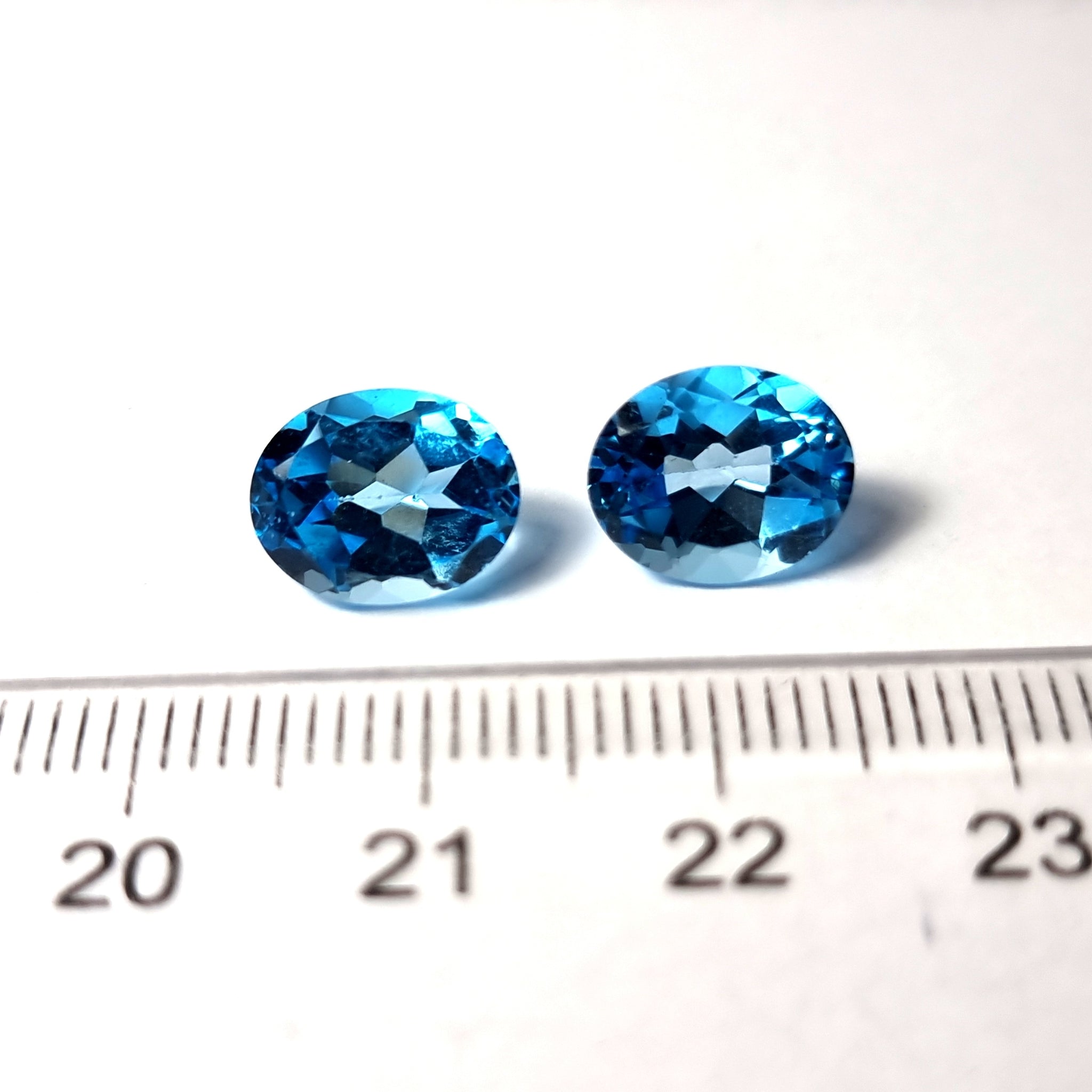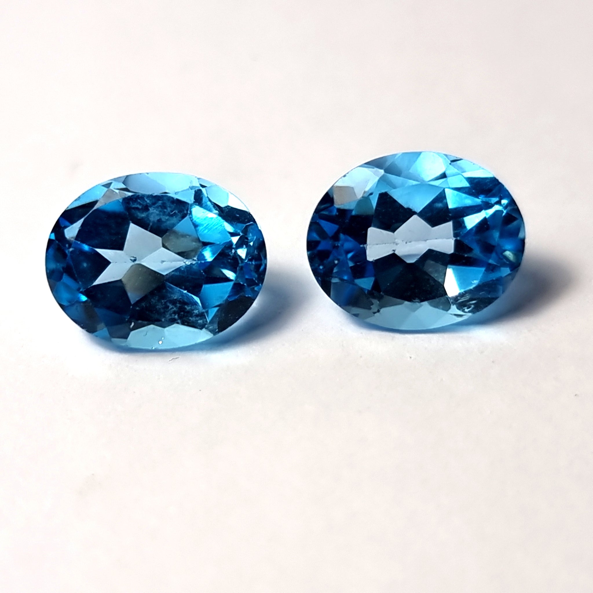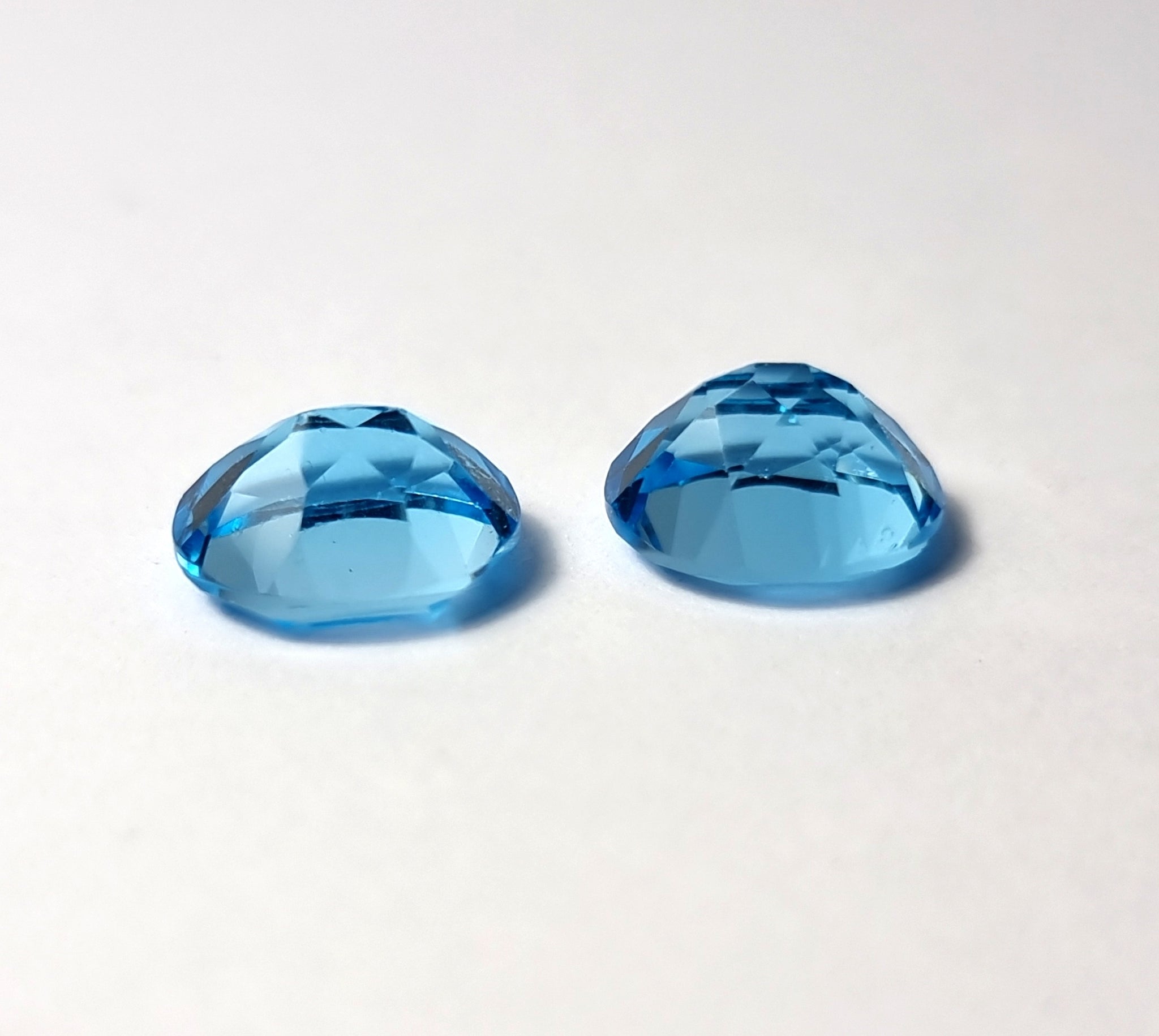 Pareja de Topacios Swiss. Excelente color. Precio especial ya que una culata es un poco más alta que su pareja. Tratamiento: Irradiación Origen: Brasil Tallado y pulido en Barcelona Talla: Oval facetada Medida: 10x8x6'50mm