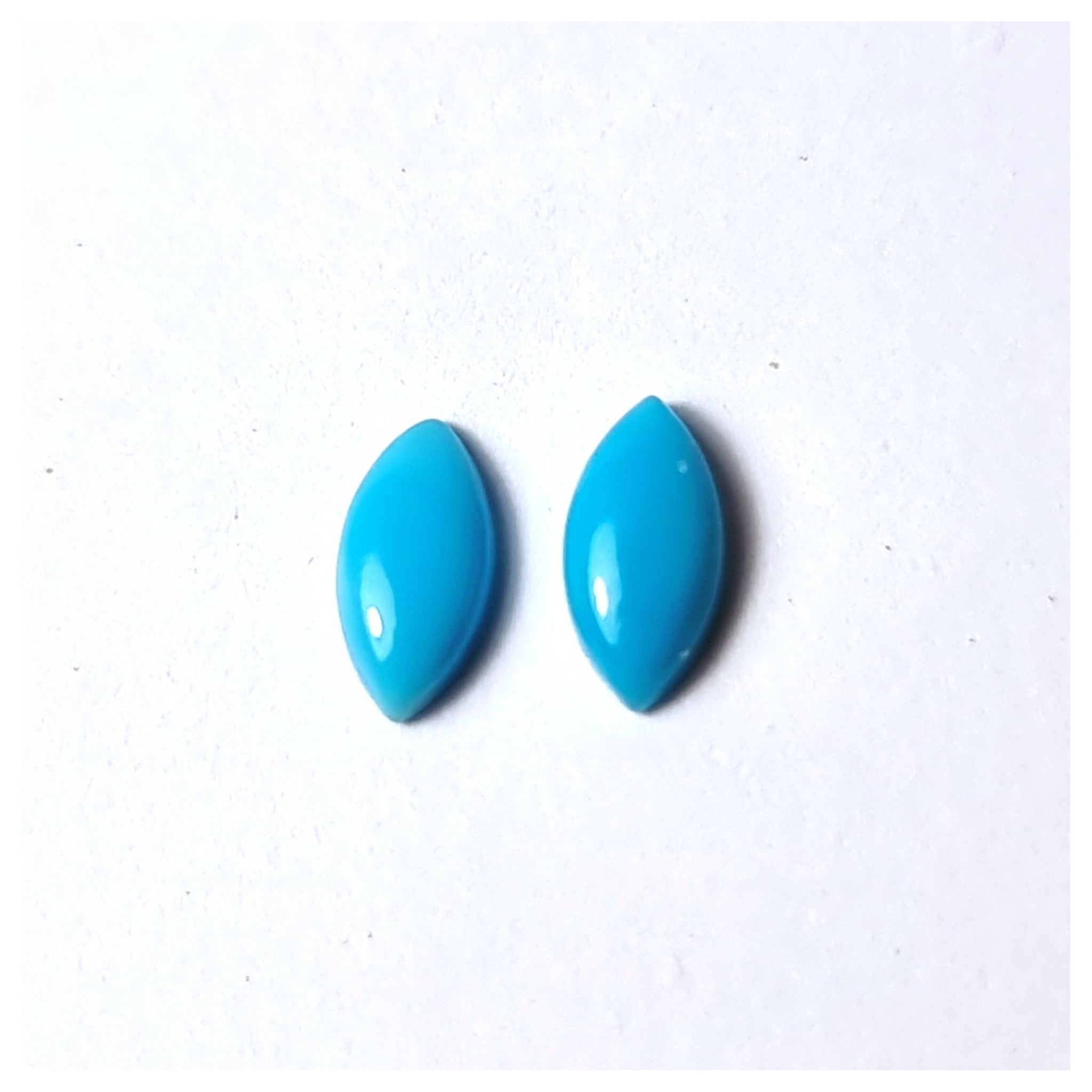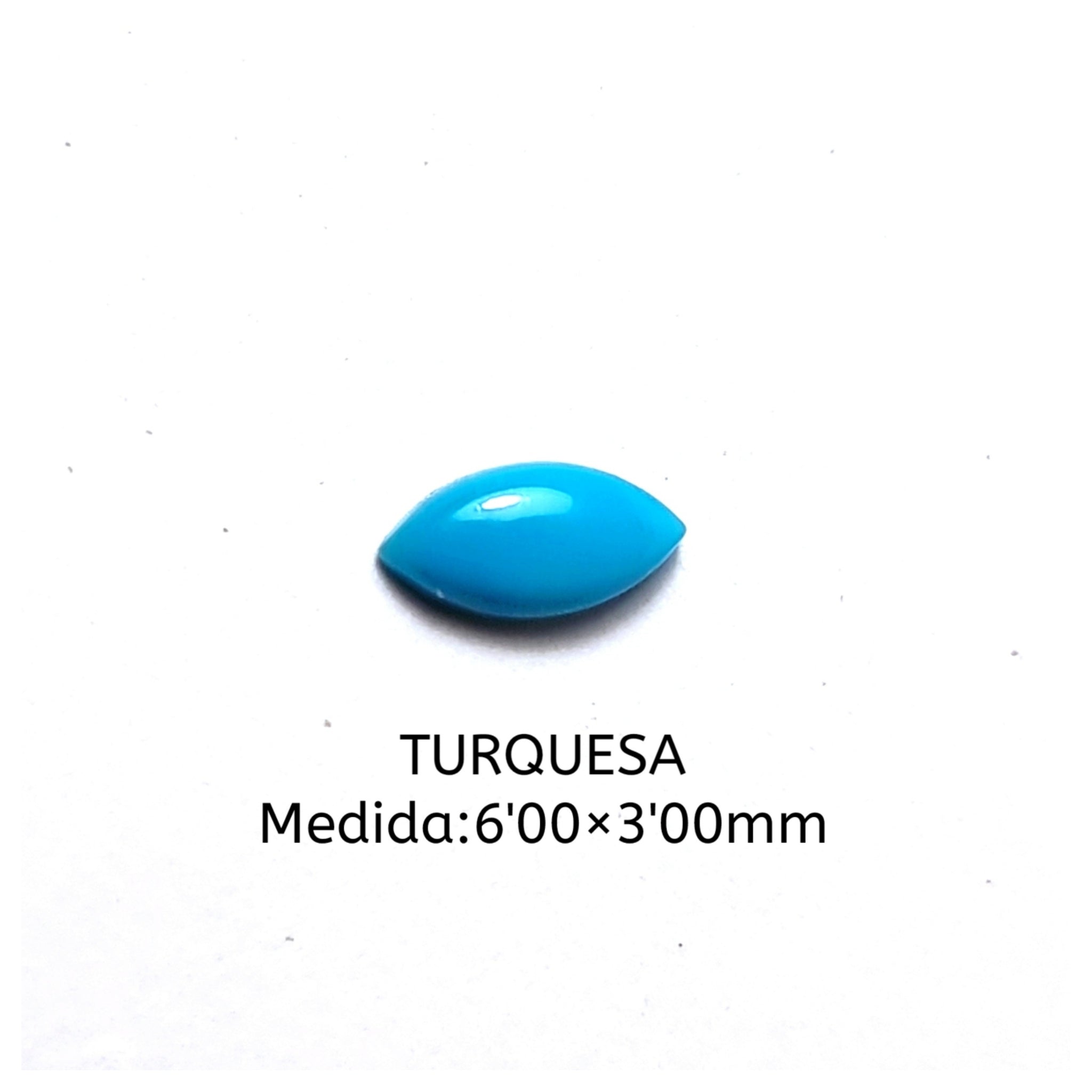 Bonita Turquesa de excelente color Origen: México Tallado y pulido en Barcelona Talla: Cabujón navette Medida: 6'00×3'00mm Unidades disponibles: 2 Precio unitario