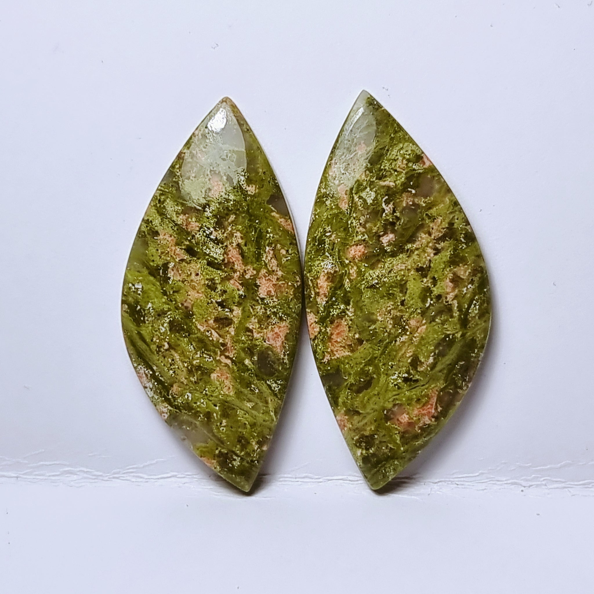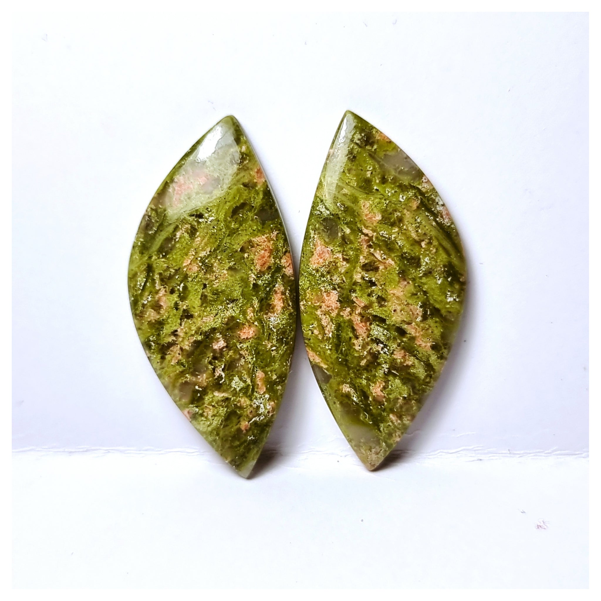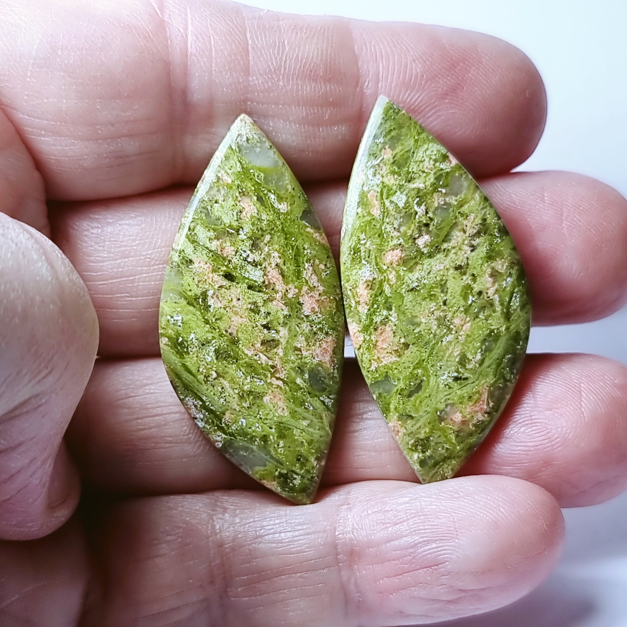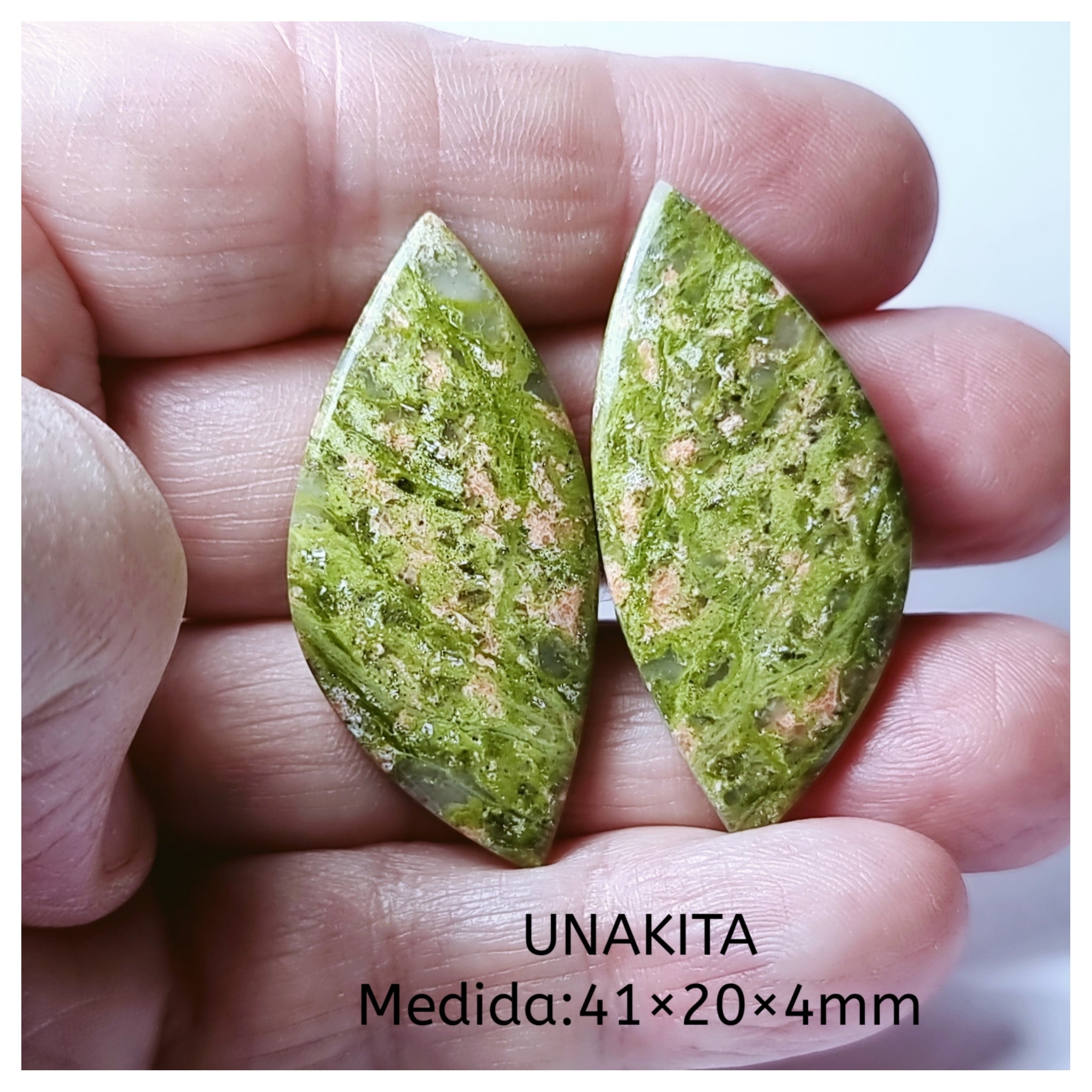Unakita en tonos verdes, naranja y amarillo Origen: África Tallado y pulido en Barcelona Talla: Cabujón cometa Medida: 41×20×4mm Precio unitario Cantidad disponible: 2