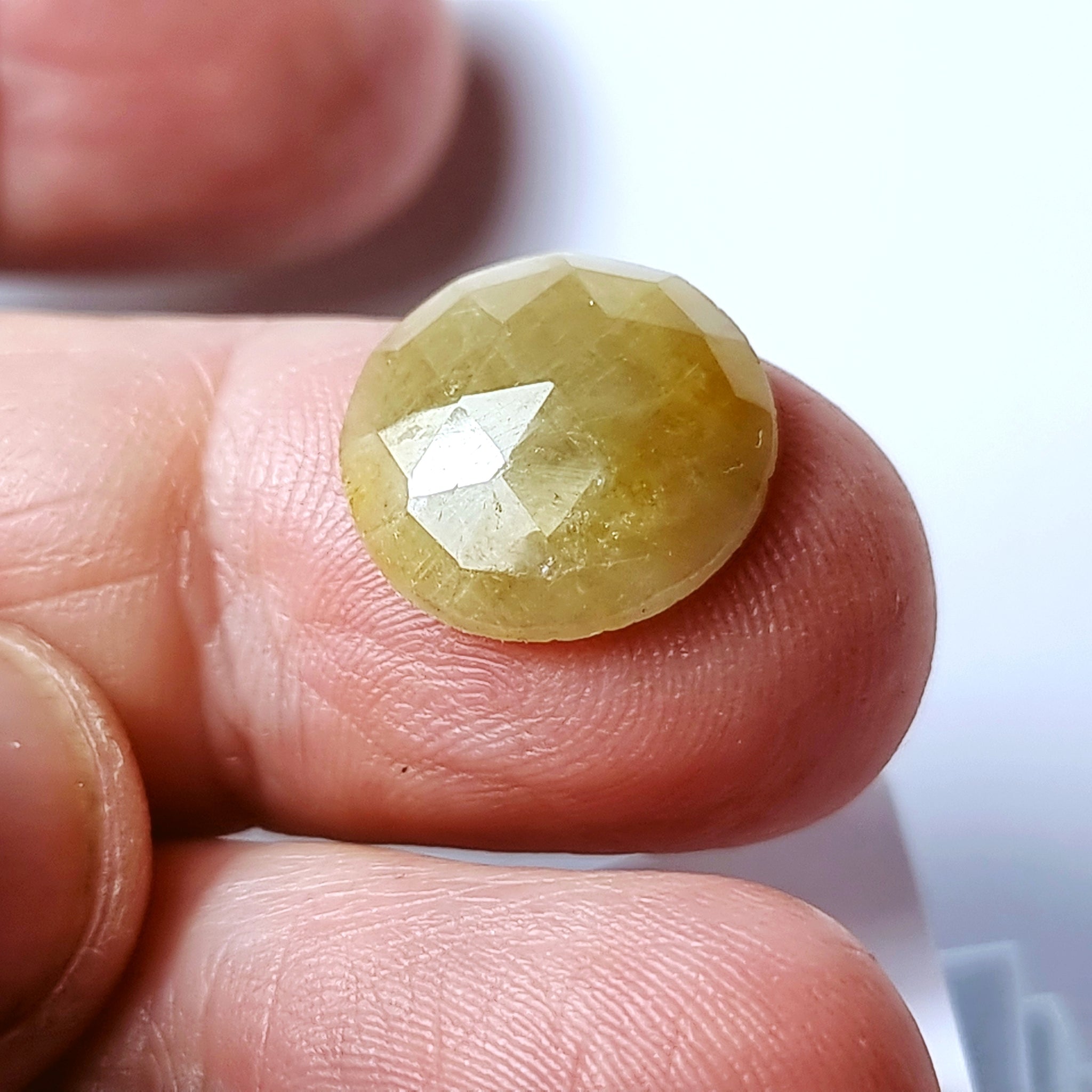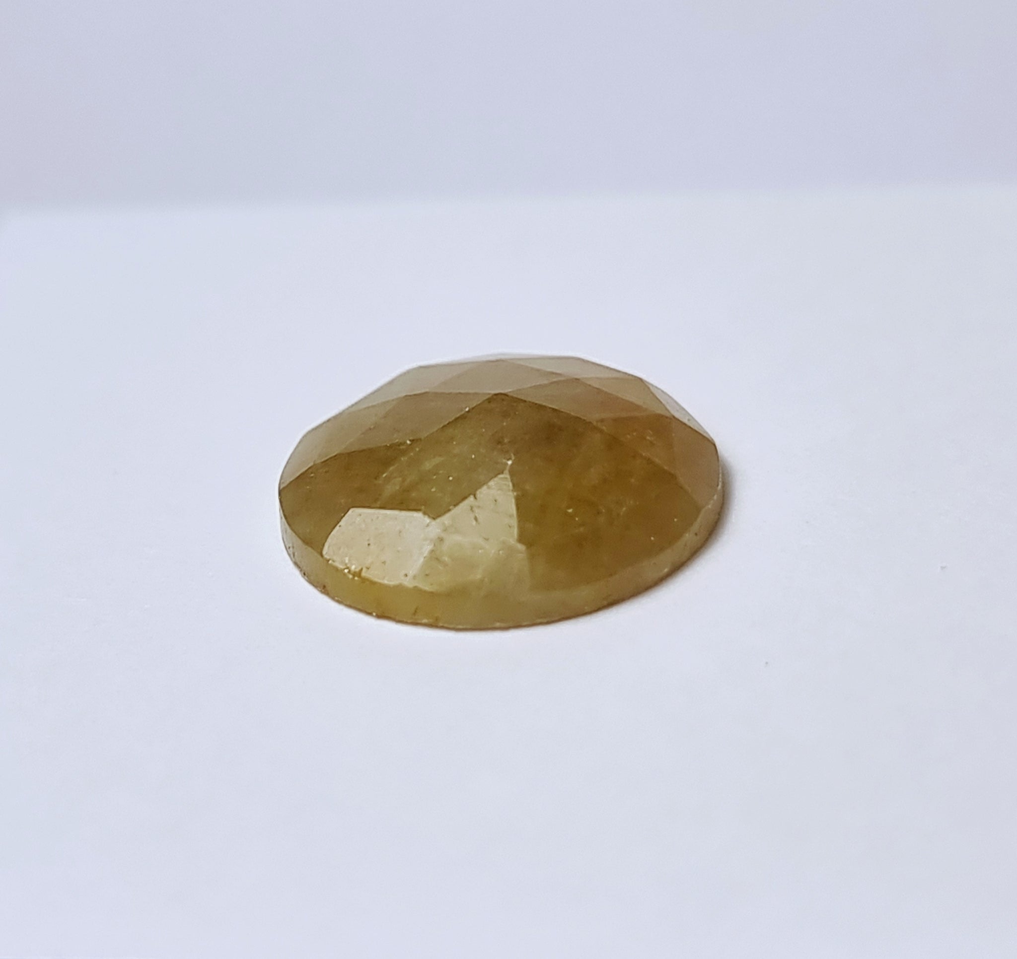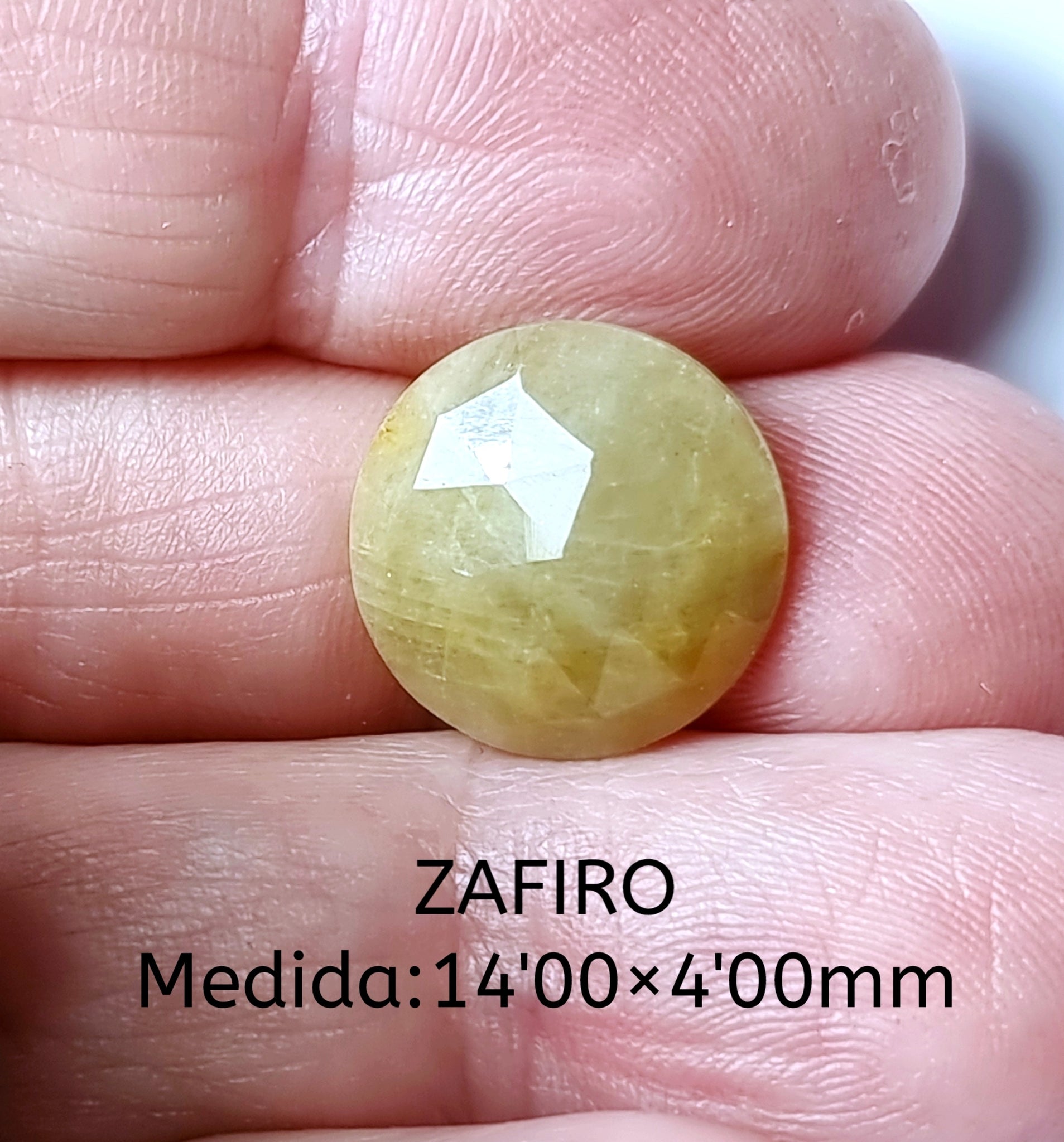 Bonito Zafiro beige de excelente facetado. Base plana Origen: Madagascar Tallado y pulido en Barcelona Talla: Facetado redondo briolette Medida: 14×4mm Precio unitario Unidades disponibles: 3