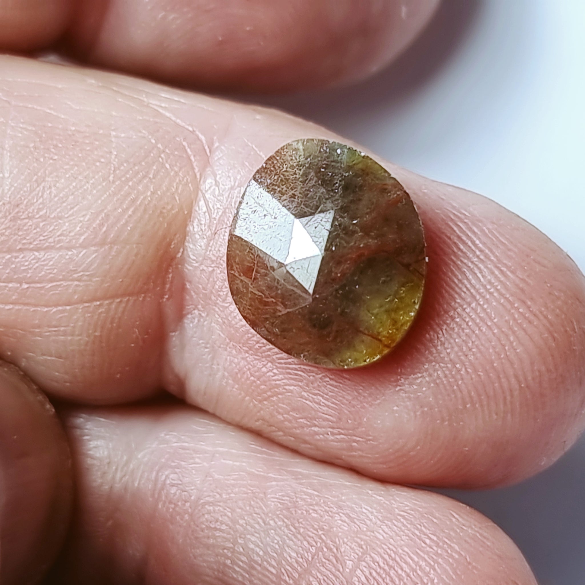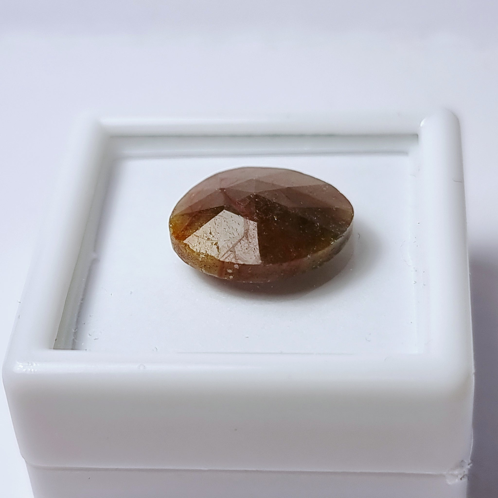 Bonito Zafiro marrón. Base planaOrigen: MadagascarTallado y pulido en BarcelonaTalla: Facetado briolette cometaMedida: 14x10x4mm